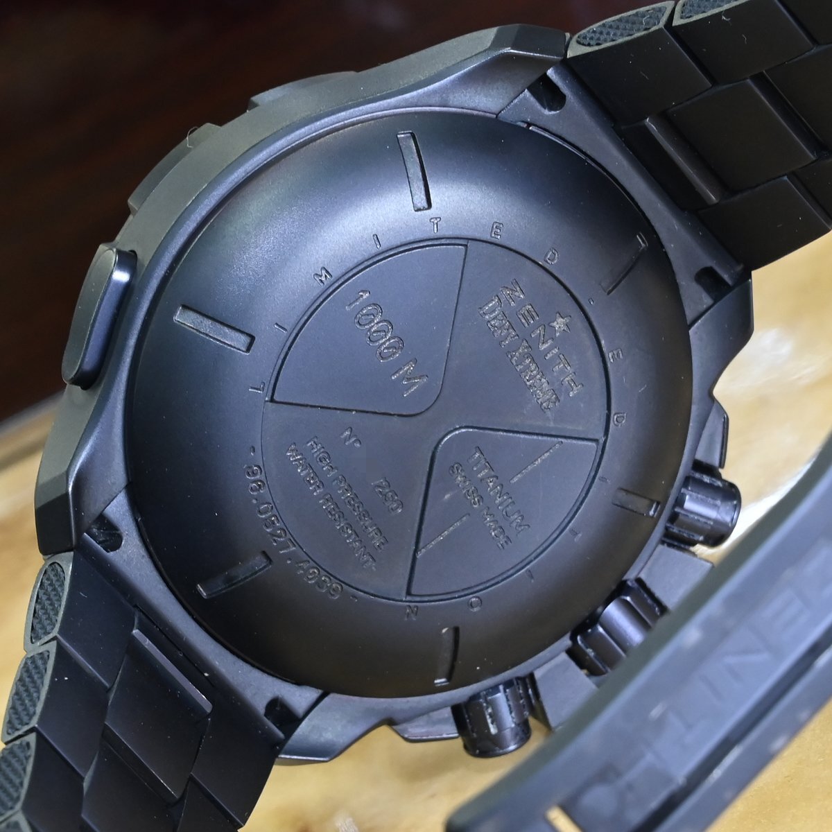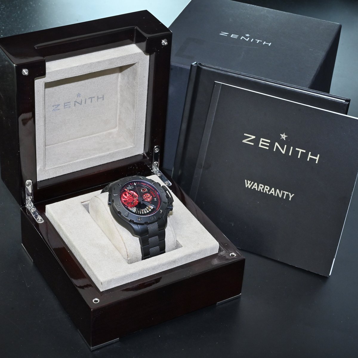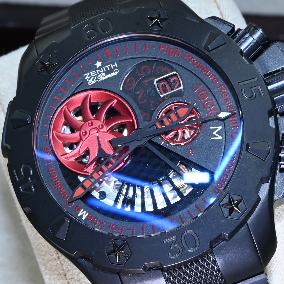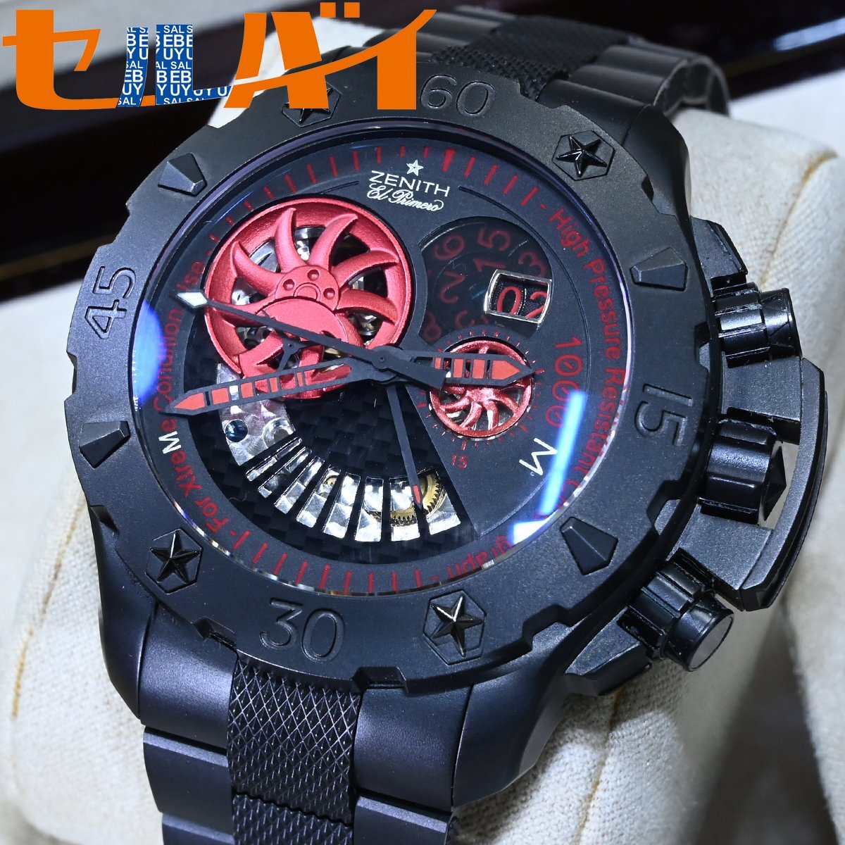 ゼニスの96.0527.4039 デファイ エクストリーム オープン ステルスです。 エスペラント語で「第一の」を意味する「エル・プリメロ」。 開発当時、名前の通り世界初の自動巻きクロノグラフでした。 36000振動を誇るハイビート設計がもたらす高精度でクロノグラフ世界最高峰とも言われています。 黒に沈むチタンケース、鋭いエッジ、そして名の通り“ステルス”な存在感。 それが Defy Xtreme Open Stealth。 直径 46.5mm のビッグケースに収められるのは、ゼニスの誇り El Primero 4039SX。 毎時36,000振動、1/10秒を刻むハイビートクロノ。 オープンダイヤルからはエスケルトンのテンプが覗き、その鼓動が生きている証を告げる。 ベゼルはブラックチタン、プッシュボタンはカーボン。 ヘリウムエスケープバルブを備え、防水1000m という桁外れのスペックを誇る。 ラグジュアリーとプロユースの融合、それがDefy Xtremeの哲学だ。 ※基本動作確認済。 |