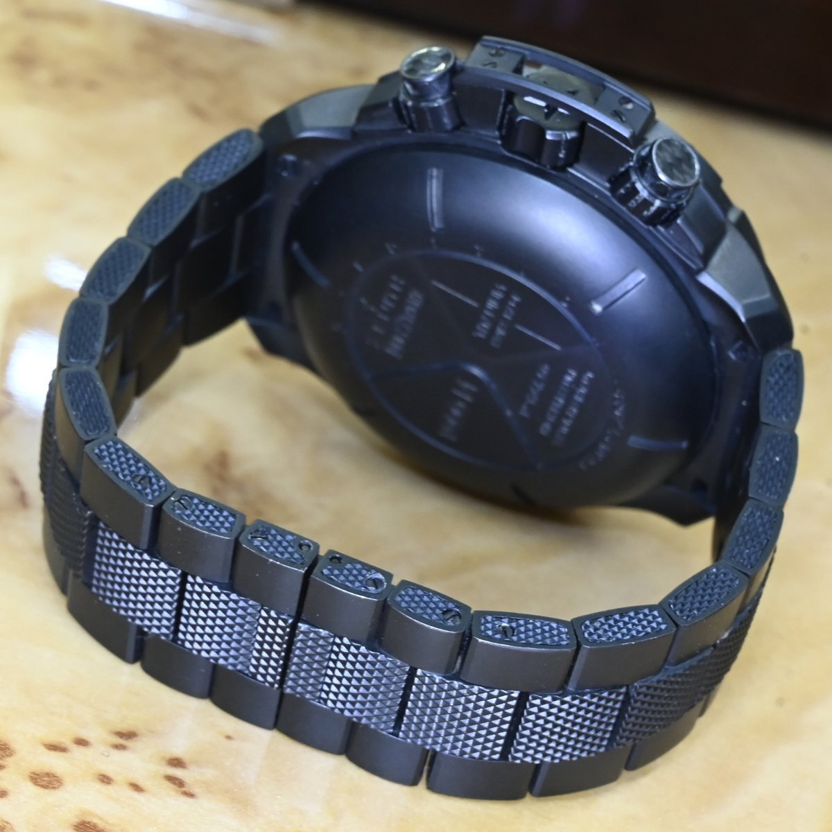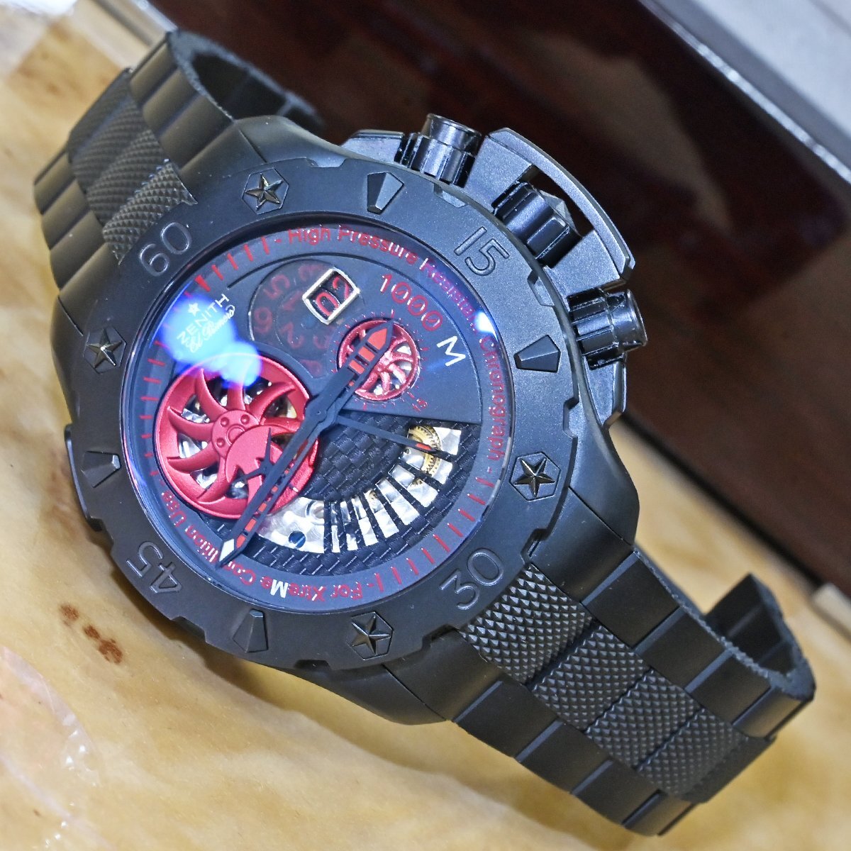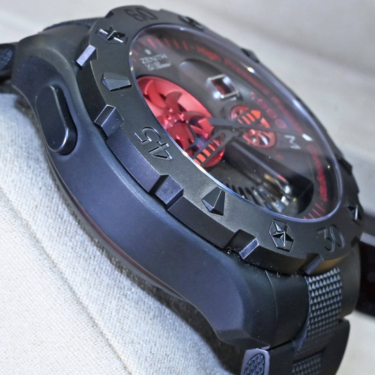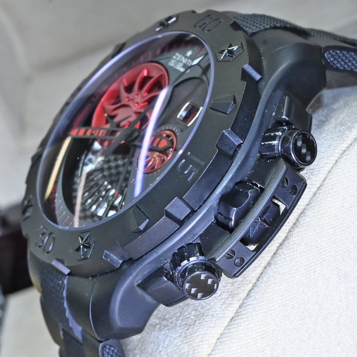 ゼニスの96.0527.4039 デファイ エクストリーム オープン ステルスです。 エスペラント語で「第一の」を意味する「エル・プリメロ」。 開発当時、名前の通り世界初の自動巻きクロノグラフでした。 36000振動を誇るハイビート設計がもたらす高精度でクロノグラフ世界最高峰とも言われています。 黒に沈むチタンケース、鋭いエッジ、そして名の通り“ステルス”な存在感。 それが Defy Xtreme Open Stealth。 直径 46.5mm のビッグケースに収められるのは、ゼニスの誇り El Primero 4039SX。 毎時36,000振動、1/10秒を刻むハイビートクロノ。 オープンダイヤルからはエスケルトンのテンプが覗き、その鼓動が生きている証を告げる。 ベゼルはブラックチタン、プッシュボタンはカーボン。 ヘリウムエスケープバルブを備え、防水1000m という桁外れのスペックを誇る。 ラグジュアリーとプロユースの融合、それがDefy Xtremeの哲学だ。 ※基本動作確認済。 |