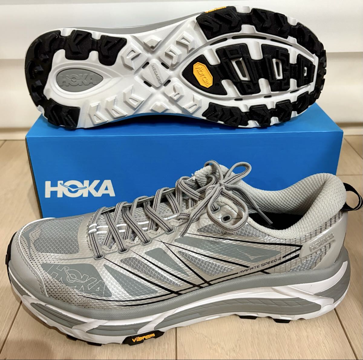 オークションをご覧いただきありがとうございます。2024年8月1日に発売されたHoka Mafate Speed 2 &Stellar Grey/Galactic Greyです。アークネットのオンラインストアで購入しました。サイズは28.5cmのゴールデンサイズです。アークネットのオンラインショップで購入しました。1回短時間履いた超極上美品です。足に合わないので、大切に保管していました。履く機会がないので出品します。