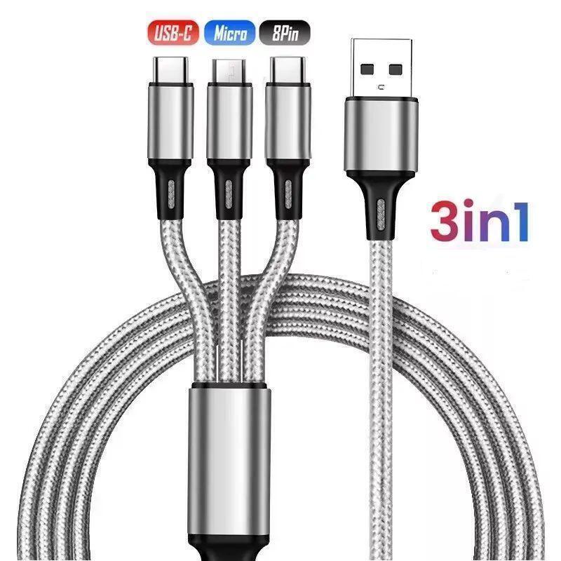 マルチ 急速充電 充電ケーブル 60W 3A 3in1 1.2m 1本 シルバー色