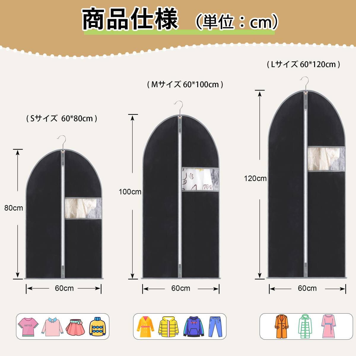 説明 VECELO 衣類カバー 防塵カバー 5枚組 ジッパー付き 湿気取り 防汚 コート ダウンジャケット Tシャツ 半袖パンツ収納袋 透明窓付き 折り畳み可能 80CM/100CM/120CM