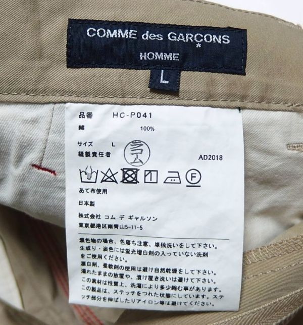 <商品名> COMME des GARCONS HOMME コムデギャルソンオム HC-P041 AD2018 ツータック 変形 パンツ L <サイズ> L <詳しい寸法> ウエスト88股上47股下49.5裾幅24(単位:㎝) ぐらいです。 <商品状態> 多少の使用感、細かい汚れ、薄い汚れがございますが着用に問題はございません。多少裾上げされております。 <商品説明> HC-P041 AD2018 2019年春夏の商品