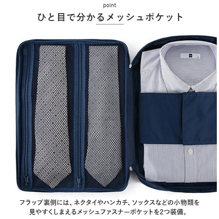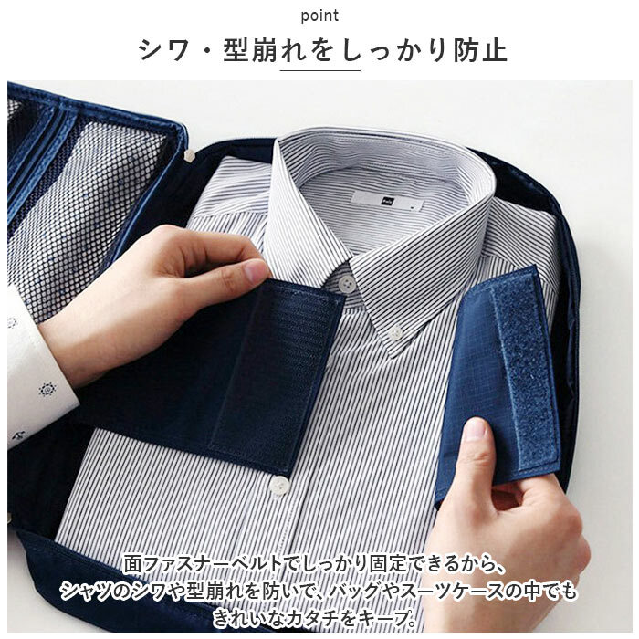 | 商品説明 | ・・出張などのビジネストラベルに大活躍!Yシャツをコンパクトに収納できる「シャツケース」が新登場。 ・【スリムなのに最大3枚収納!】 ・ダブルファスナーで大きく開閉する薄型コンパクトなケースに、最大3枚のYシャツを収納可能。 ・【シワ・型崩れをしっかり防止】 ・面ファスナーベルトでしっかり固定できるから、シャツのシワや型崩れを防いで、バッグやスーツケースの中でもきれいなカタチをキープ。 ・【ひと目で分かるメッシュポケット】 ・フラップ裏側には、ネクタイやハンカチ、ソックスなどの小物類を見やすくしまえるメッシュファスナーポケットを2つ装備。 ・【折りたたみシャツパッド付き】 ・ガイドに従って、Yシャツをキレイに折りたためるプラスチックシート「折りたたみシャツパッド」が2枚付属。 ・【持ち運びにも便利】 ・ケースの片側のハンドルベルトで、ケース単体でもスマートに持ち運びが可能。旅行前のパッキング作業もスムーズに。 ・【清潔感あふれるスタイルに】 ・世界を忙しく飛び回るビジネスマンとって、白さの際立つYシャツは必須アイテム。旅行先でもパリッと清潔感のあるスタイルを実現。 |
