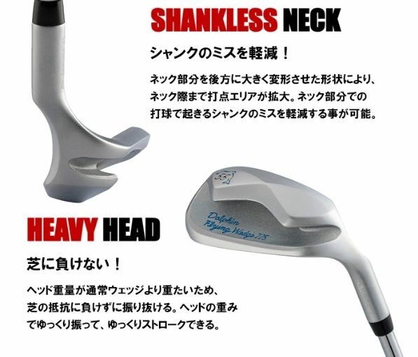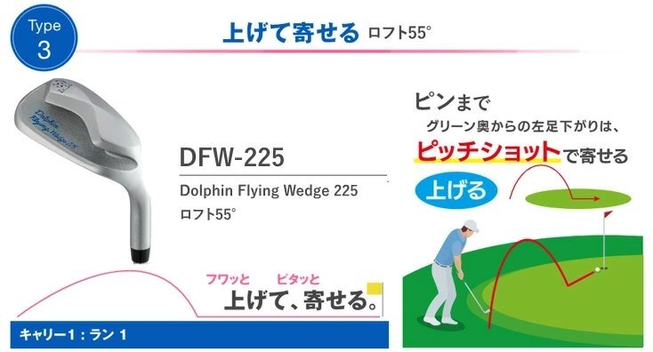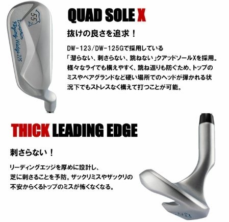 寄せワン連発!上げて、寄せる、ピッチショットが楽になる。 ●上げて、寄せる!:グリーン奥からの左足下がり、逆目のラフから、バンカー越えやピン近くの砲台グリーンの場面。 ●抜けの良さを追求!:DW-123/DW-125Gで採用している「潜らない、刺さらない、跳ねない」クアッドソールXを採用。様々なライでも構えやすく、跳ね返りも防ぐため、トップのミスやベアグランドなど硬い場所でのヘッドが弾かれる状況下でもストレスなく構えて打つことが可能。 ●刺さらない!:リーディングエッジを厚めに設計し、芝に刺さることを予防。ザックリミスやザックリの不安からくるトップのミスが怖くなくなる。 シャンクのミスを軽減!:ネック部分を後方に大きく変形させた形状により、ネック際まで打点エリアが拡大。ネック部分での打球で起きるシャンクのミスを軽減する事が可能。 ●芝に負けない!:ヘッド重量が通常ウェッジより重たいため、芝の抵抗に負けずに振り抜ける。ヘッドの重みでゆっくり振って、ゆっくりストロークできる。 ●チッパーよりも使える!:フェース高さを一般的なチッパーよりも高く設計。一般的なチッパーのフェース高さでは、ラフなどボールが浮いている時にくぐってしまうが、幅広い場面で使うことができる。 ヘッド素材:軟鉄。 バンス角:トゥ -7° センター 0° ヒール -6° 日本正規品。 |