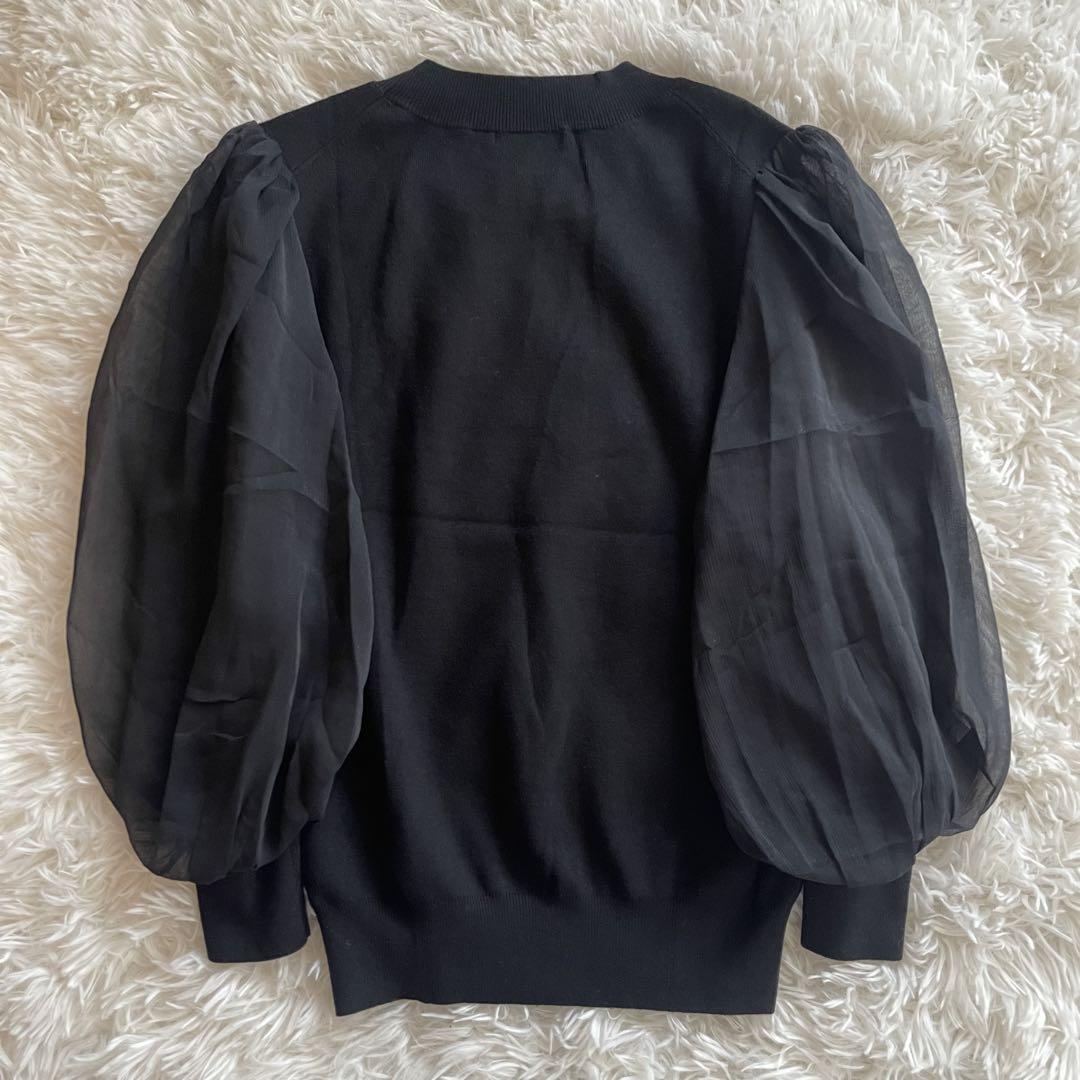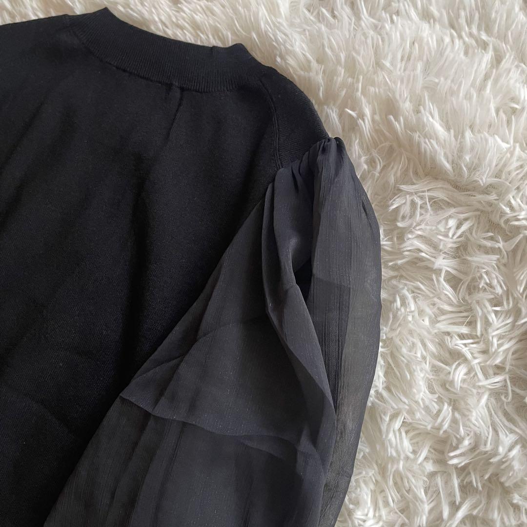 身頃はレーヨン混で柔らかく落ち感のあるニット、袖は透け感のあるオーガンジー切り替え。フェミニンさと上品さを兼ね備えたデザインで、きれいめカジュアルや通勤コーデにも合わせやすい一枚です。