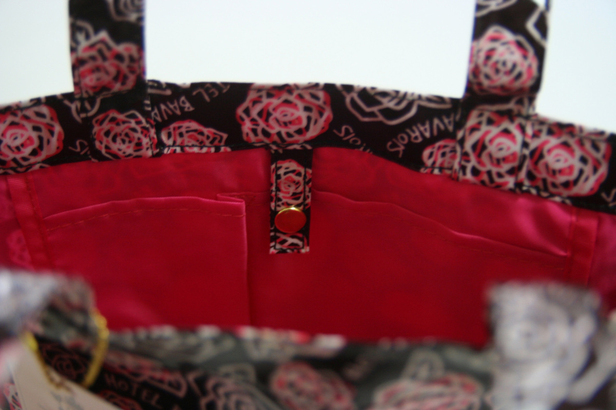 ・トートバッグの入り口は中央のボタンで留めるタイプです。中には、二つに分かれた収納が一つ付いています。