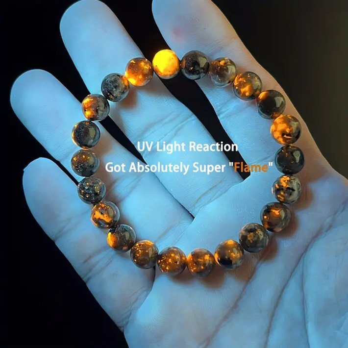 UVライトを当てると内側からオレンジ色に発光し、まるで燃え上がる炎のような幻想的な光を放ちます。