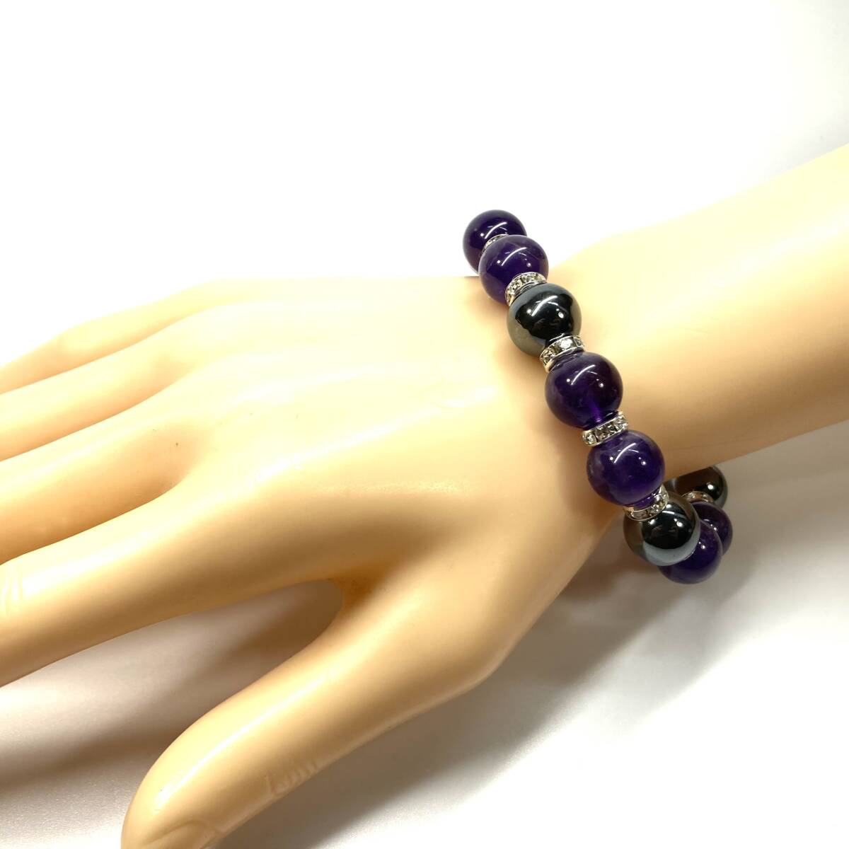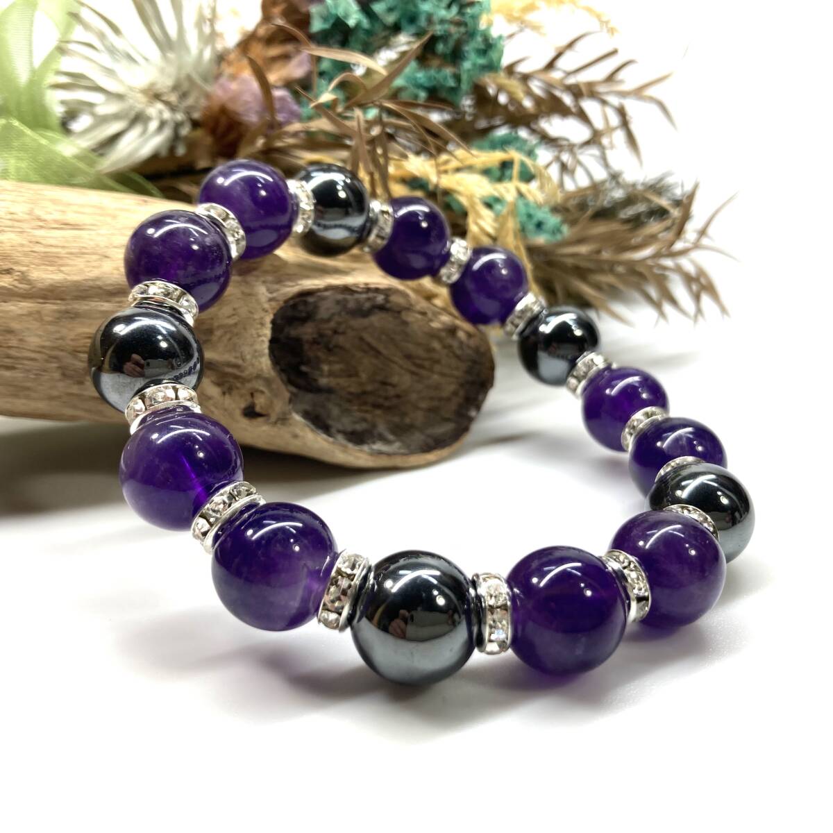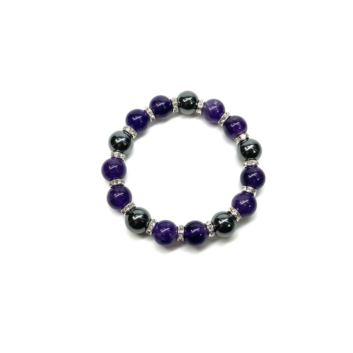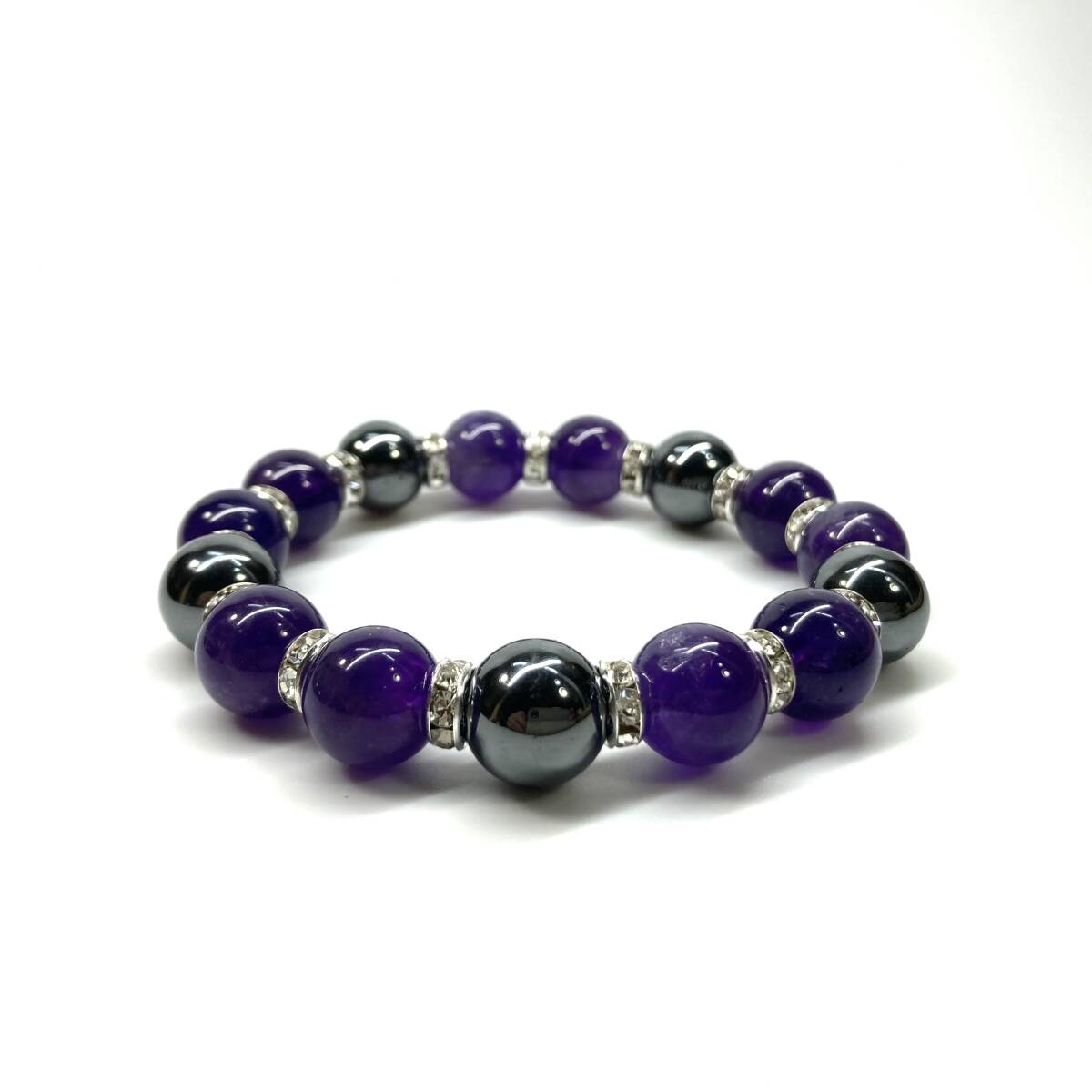 こちらは、ヘマタイトとアメジストを組み合わせたパワーストーンブレスレットです。間にはロンデルを挟み高級感あるデザインに仕上げております。石大きさは12mm玉を使用して内周約18cmです。気になる方は是非この機会にどうぞ。