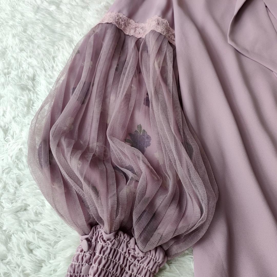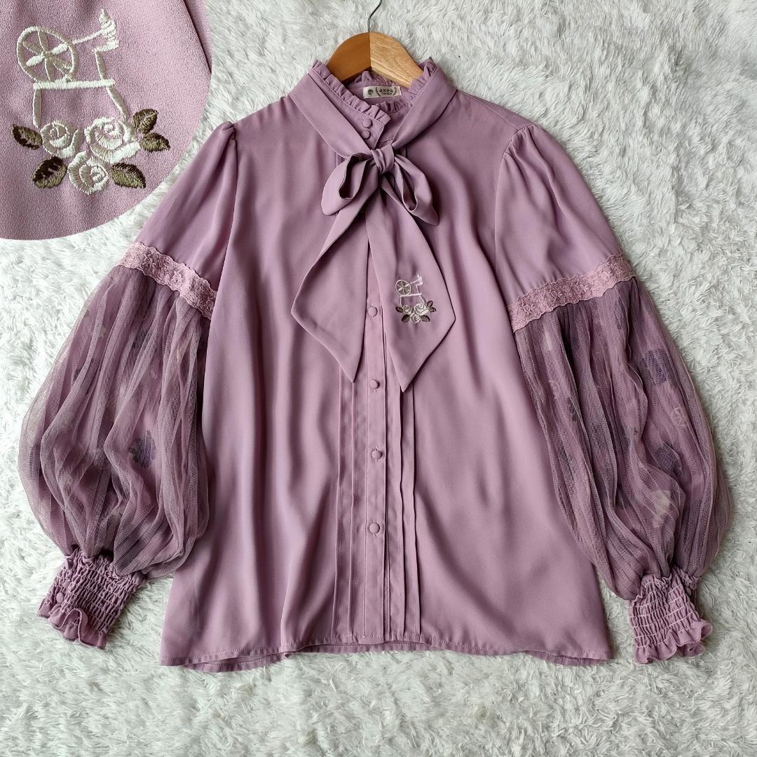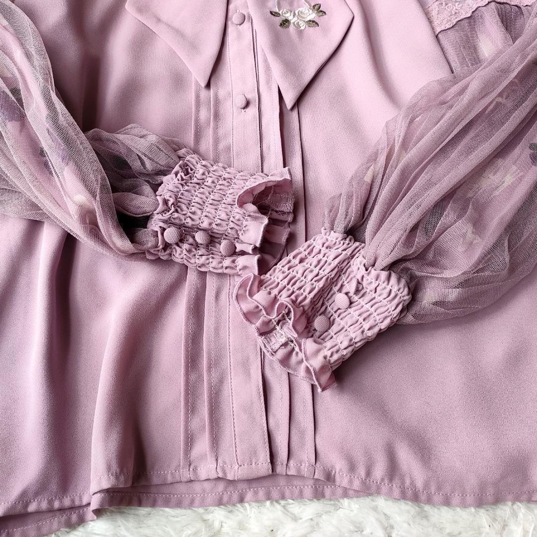 物語に登場する妖精やお城、かわいい動物たちを組み合わせた総柄を使用した袖は、プリーツチュールを重ねたトレンド感のある袖ボリュームデザインがポイント。リボン先には、物語に登場する糸車やバラをイメージして組み合わせた繊細な刺繍が施されています。透け感の少ないジョーゼット生地を使用しているので、 春先までのスカートスタイリングにオススメです。