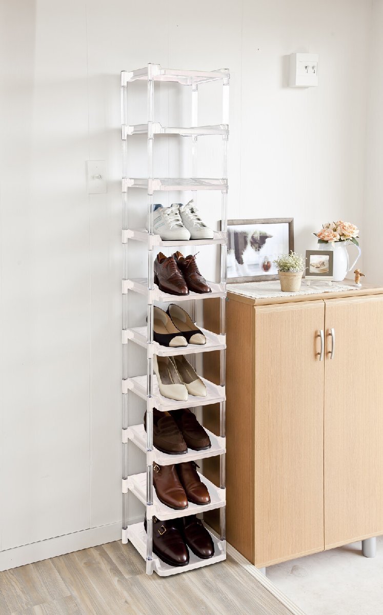 即決可@新品[日本製下駄箱]通気性抜群シューズラックシングル10段/ホワイト | ||||||||||||