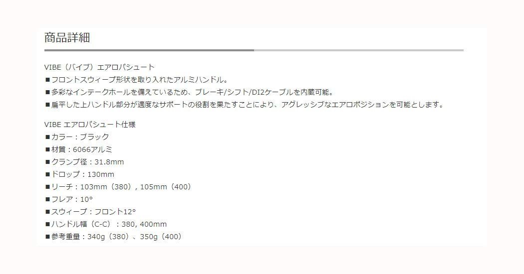 ブランド:プロ(PRO)カラー:ブラックサイズ:380mm/31.8mmVIBEエアロパシュートブランド:プロ/PROシマノパートNo:R20RHA0471XJANコード:8717009419277ハンドル幅/クランプ径380mm/31.8mmリーチ/ドロップサイズ103mm/130mmカラーブラック素材ALLOY6066重量340gVIBEエアロパシュートブランド:プロ/PROシマノパートNo:R20RHA0471XJANコード:8717009419277ハンドル幅/クランプ径380mm/31.8mmリーチ/ドロップサイズ103mm/130mmカラーブラック素材ALLOY6066重量340g