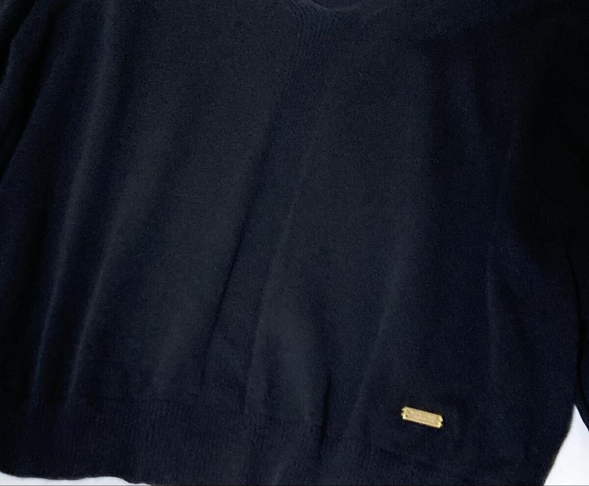 後ろチェックのおリボンがクレストブリッジらしい七分袖ニットです。浅いVネックで中央にリブのラインがあり、ドルマンスリーブになっています。裾にブランド刻印入りのプレートが付いています。
