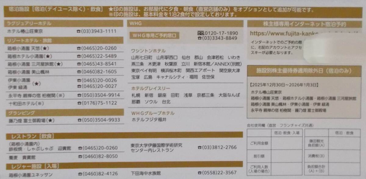 藤田観光 株主優待券 2026年3月まで ワシントンホテル ホテルグレイスリー WHGグループホテル 藤乃煌 箱根小涌園ユネッサン 下田海中水族館