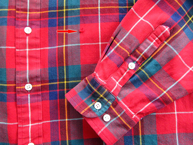 ・前面、左胸下部分に使用によるダメージ(赤矢印⇒キズ⇒補修布でリペア済)があります