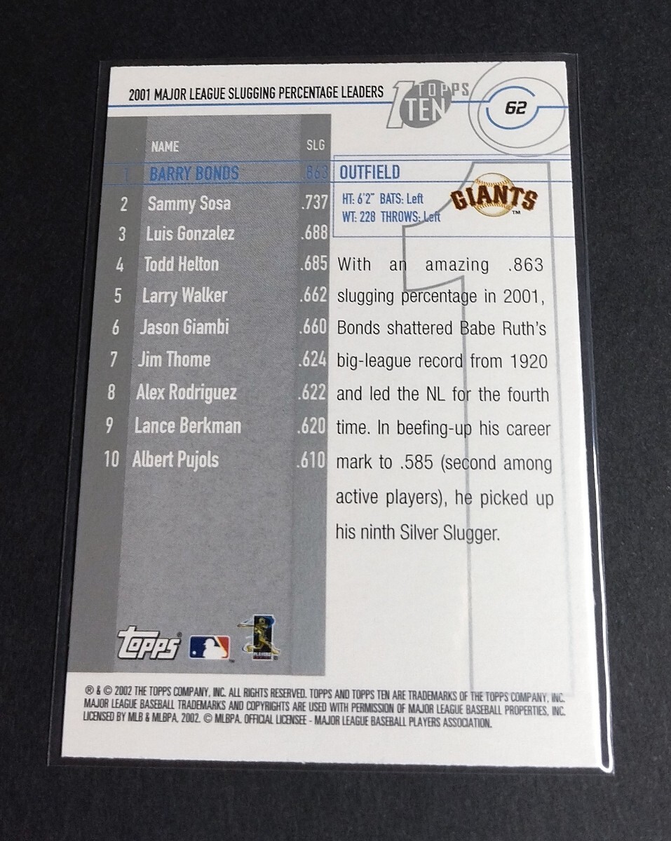 MLB 2002年topps TEN バリー・ボンズ(ジャイアンツ) SLUGGING PERCENTAGE LEADERS 1/10 No,62。 Giants BARRY BONDS