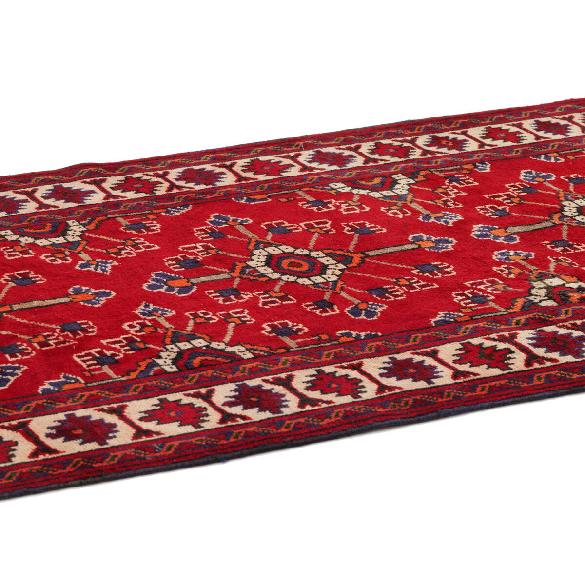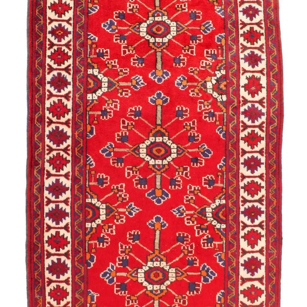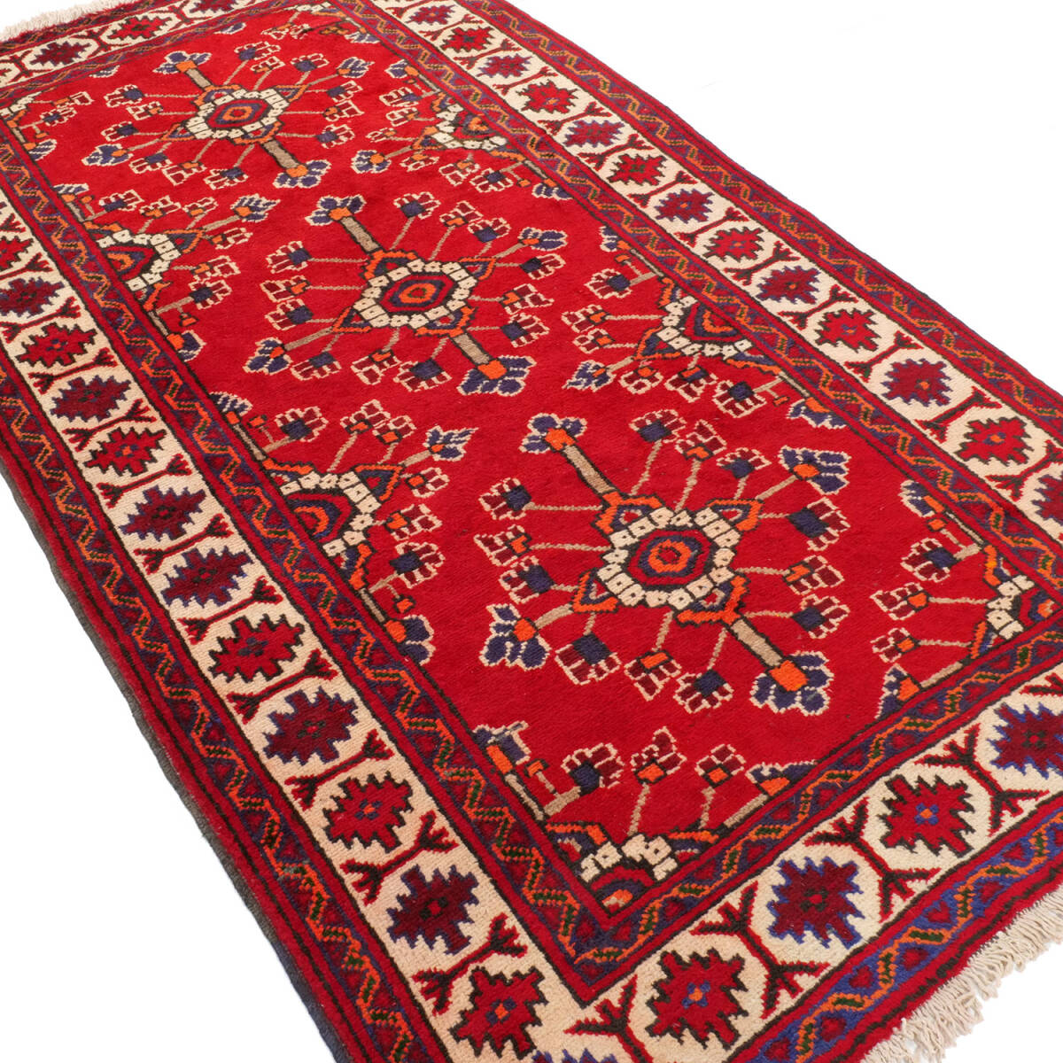 1960年代に制作されたフェルドゥース産のセミアンティークラグです。中央には連続するミナハニ文様が配され、花々が格子状に繋がる構図は、調和と華やぎを兼ね備えています。細部には小花モチーフも織り込まれ、繊細な意匠が際立つ一枚です。