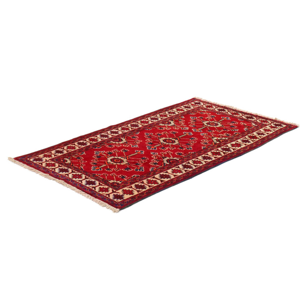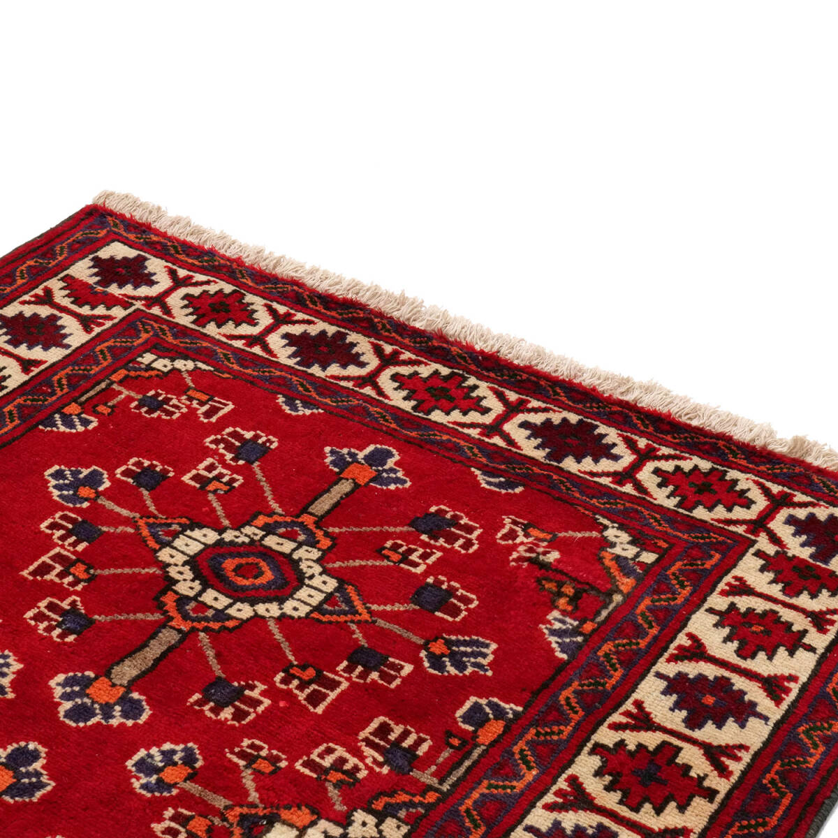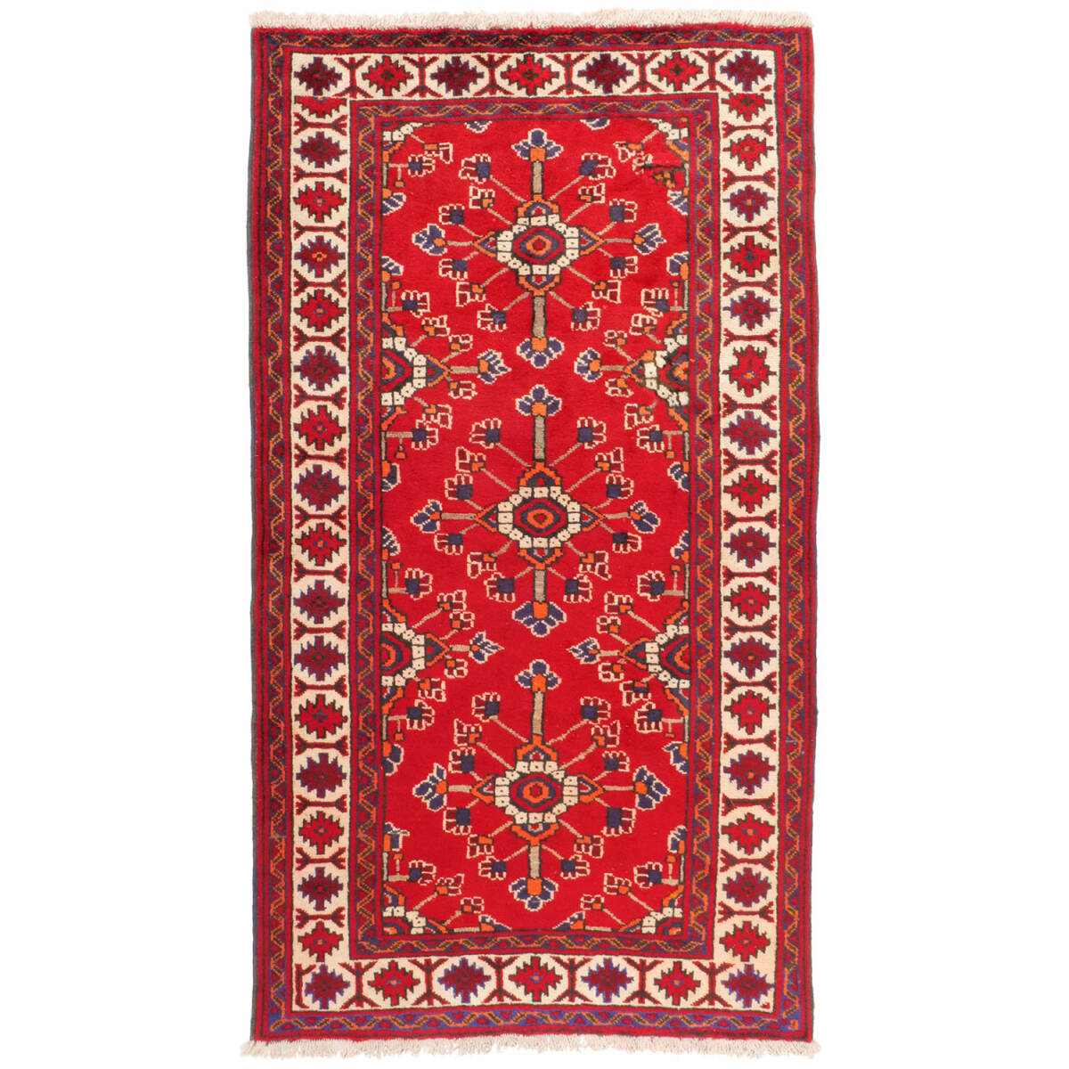 1960年代に制作されたフェルドゥース産のセミアンティークラグです。中央には連続するミナハニ文様が配され、花々が格子状に繋がる構図は、調和と華やぎを兼ね備えています。細部には小花モチーフも織り込まれ、繊細な意匠が際立つ一枚です。