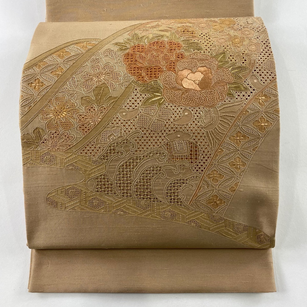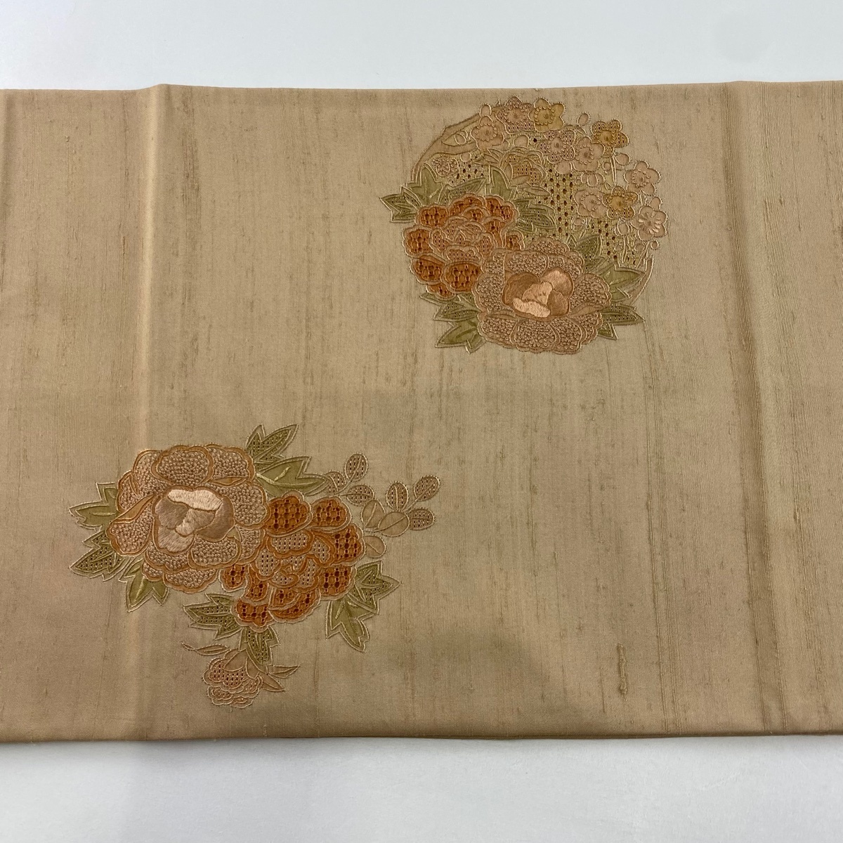 | 袋帯 美品 秀品 紬地 草花 宝尽くし 刺繍 薄茶色 お太鼓柄 正絹 【中古】 |