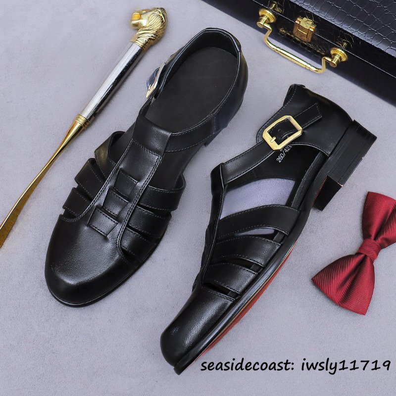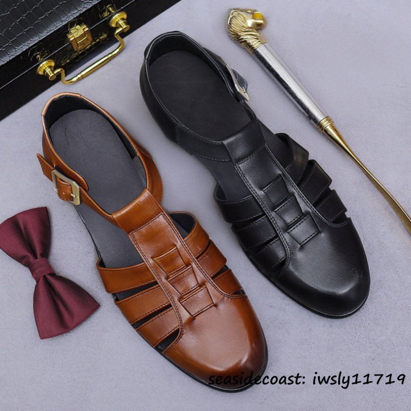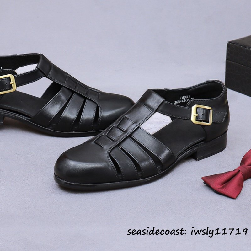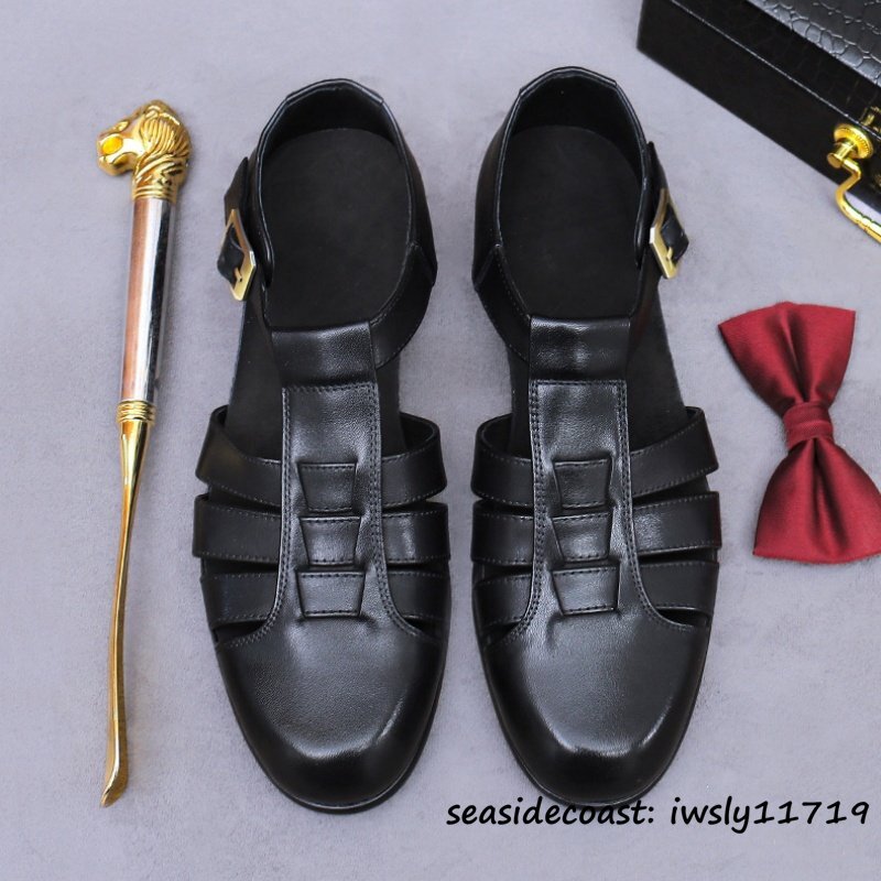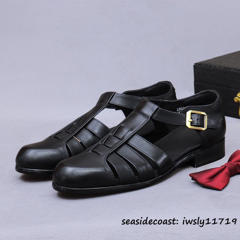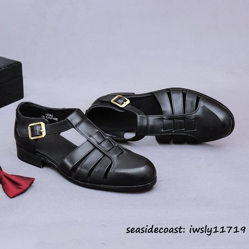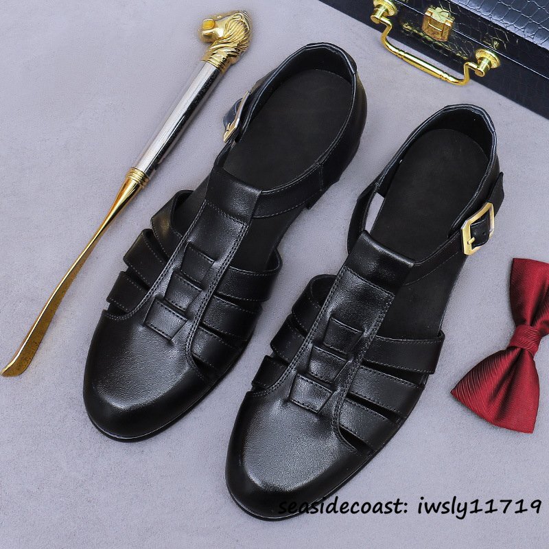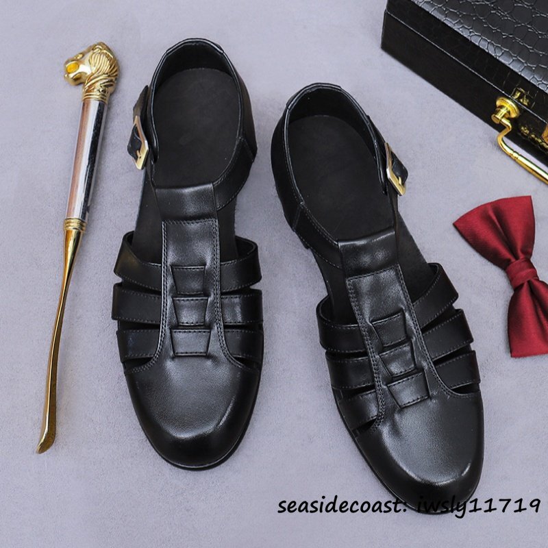 超希少◆サンダル メンズ 本革 スリッパ ビジネスシューズ 牛革 メッシュ 通気性 編み込み 紳士靴 革靴 レザーシューズ ブラック 27.5cm