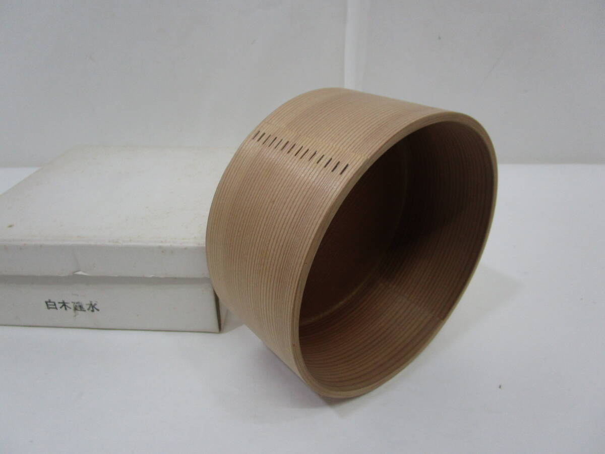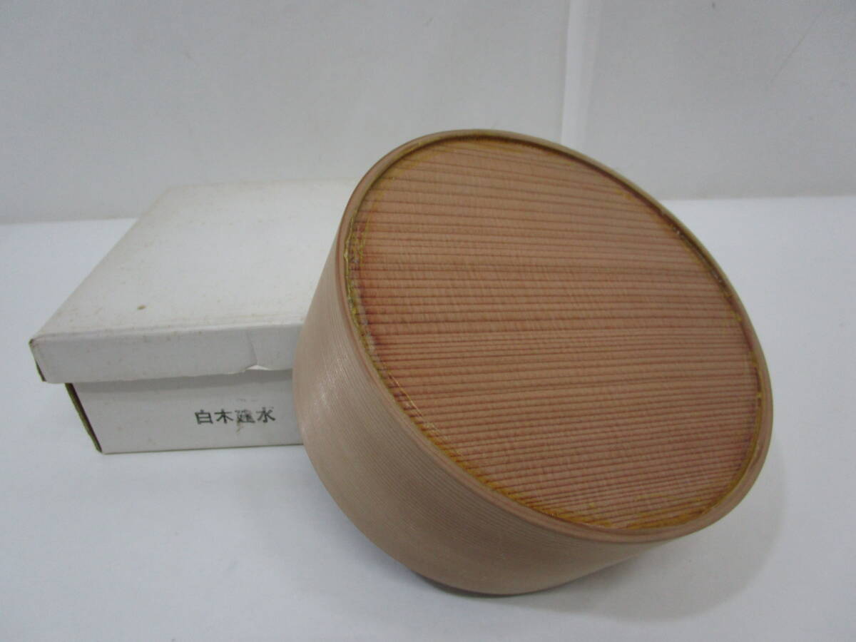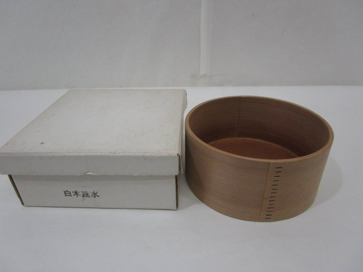 中古茶道具! 国産杉材  木地 曲建水 (こぼし)です。  直径 16cm×高さ 7.5cm 使用品です。 水漏れ無し。水漏れ防止加工のボンド跡が有ります。 紙箱はヤケ汚れ有り。  どうぞ宜しく。