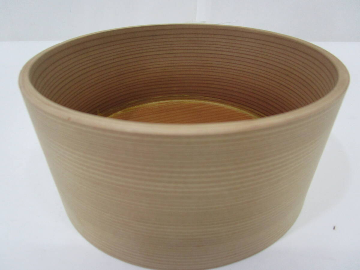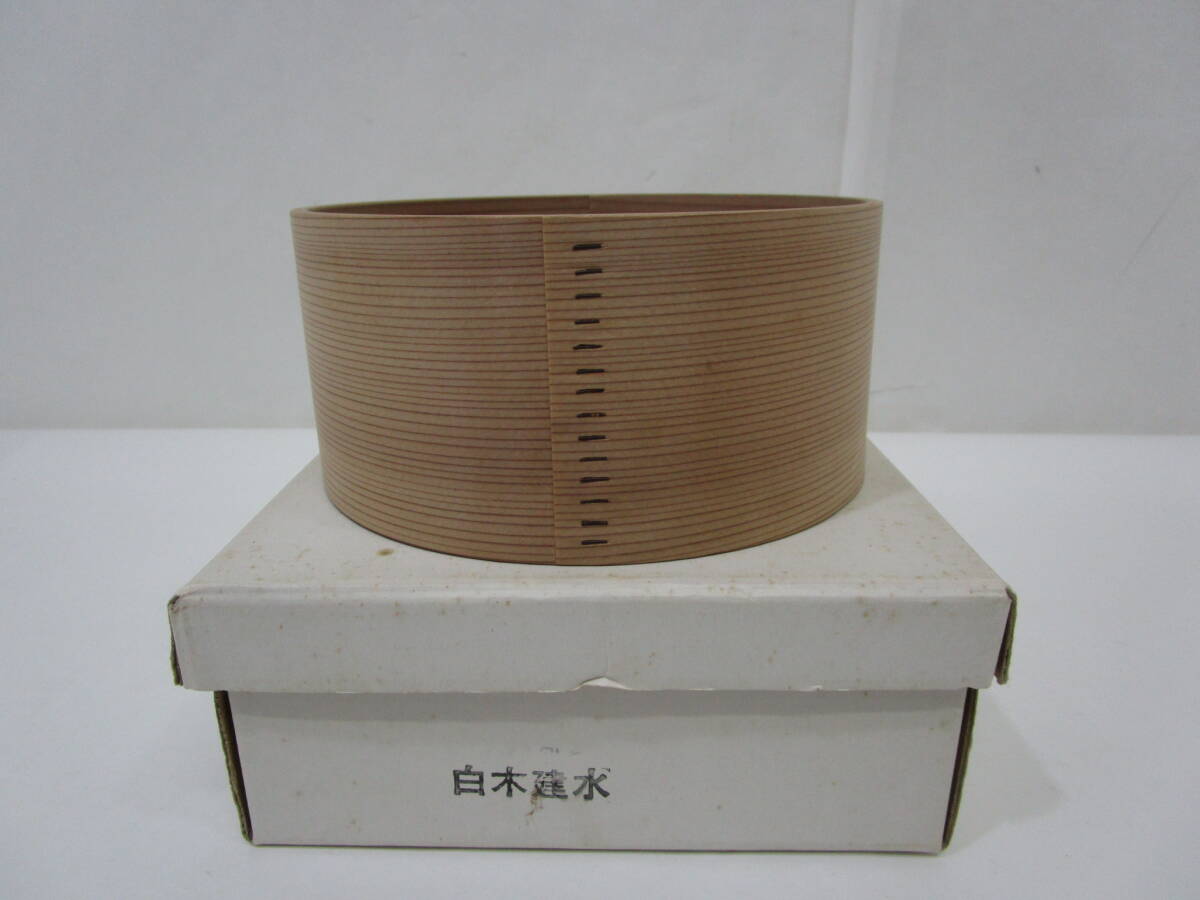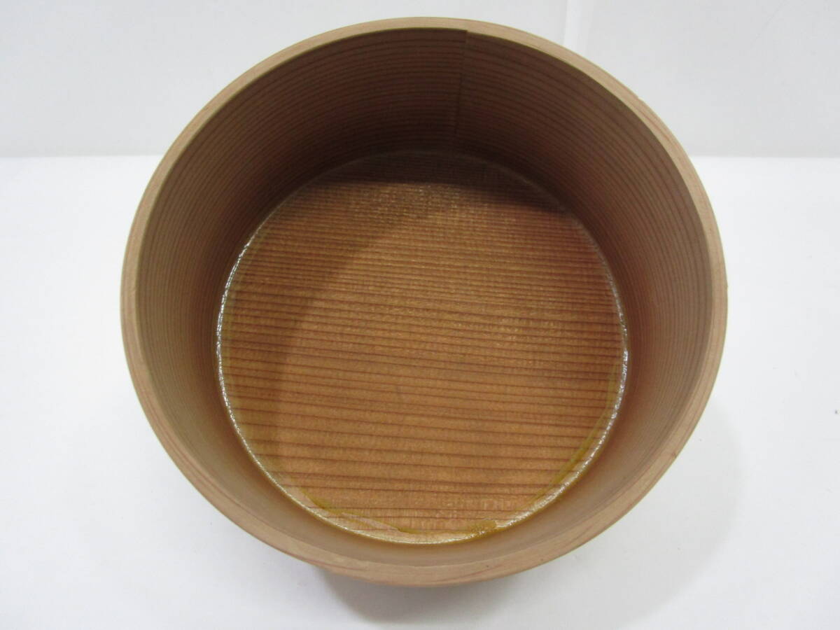 中古茶道具! 国産杉材  木地 曲建水 (こぼし)です。  直径 16cm×高さ 7.5cm 使用品です。 水漏れ無し。水漏れ防止加工のボンド跡が有ります。 紙箱はヤケ汚れ有り。  どうぞ宜しく。