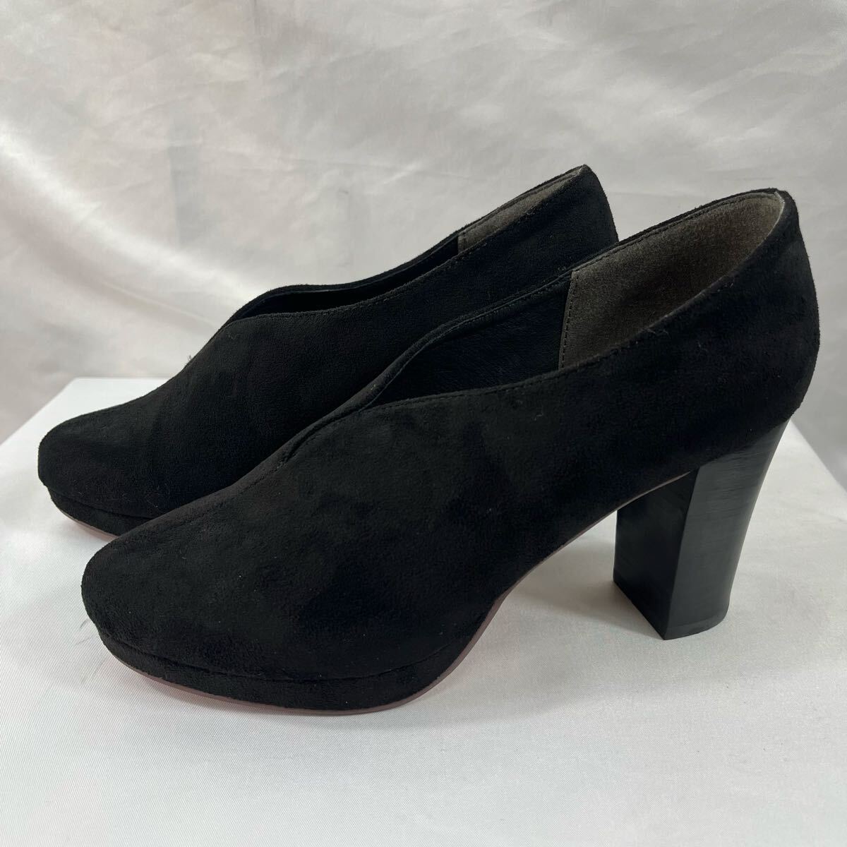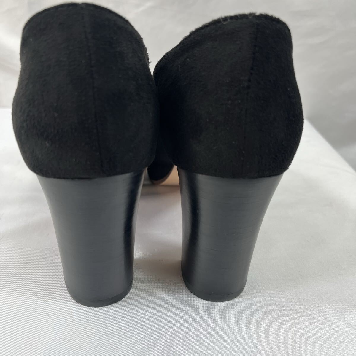 ・スエード素材のブラックブーティ、中ヒールでスタイリッシュなデザイン。