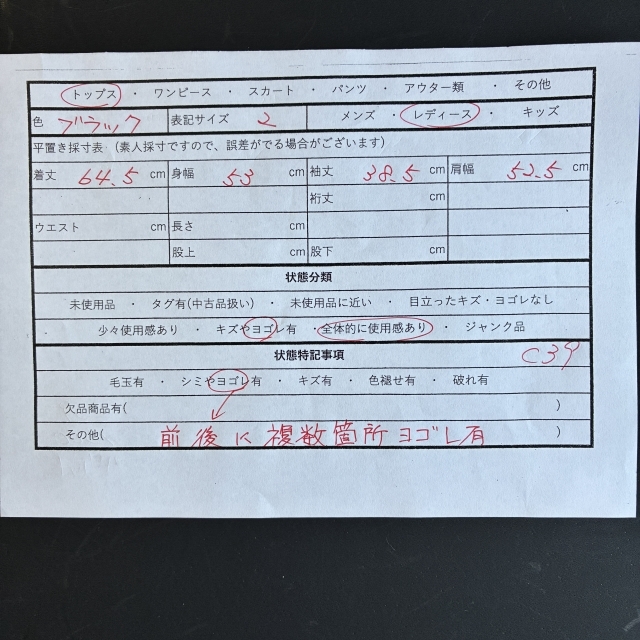 ・シミやヨゴレ有(前後に複数箇所ヨゴレ有)
