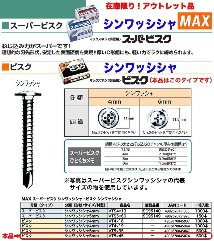 【在庫限り!アウトレット品】 〈MAX〉ビスク シンワッシシャ5mm VT5×45 〔1箱・500本入り〕 【オススメ】