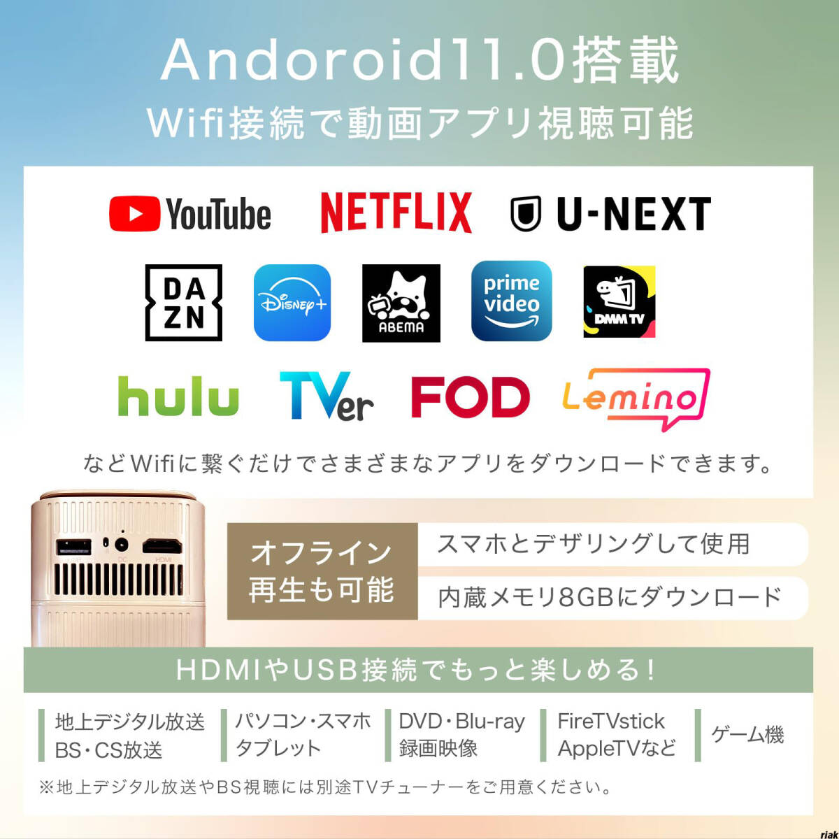 スマホやHDMI対応デバイスと接続でき、Android 11.0搭載でYouTube、Netflix、Amazonプライムビデオ、Disney+など人気アプリも快適に視聴可能です。
