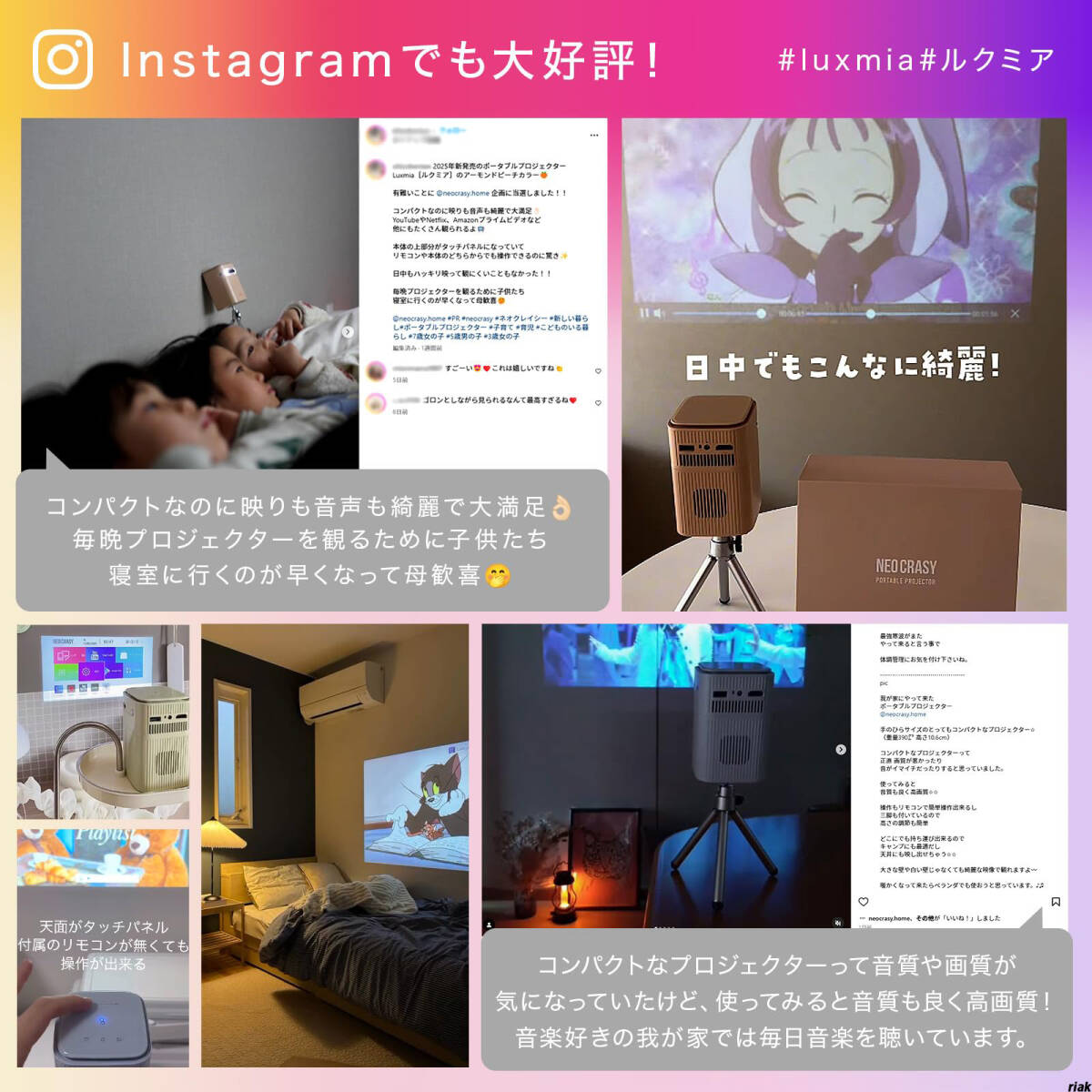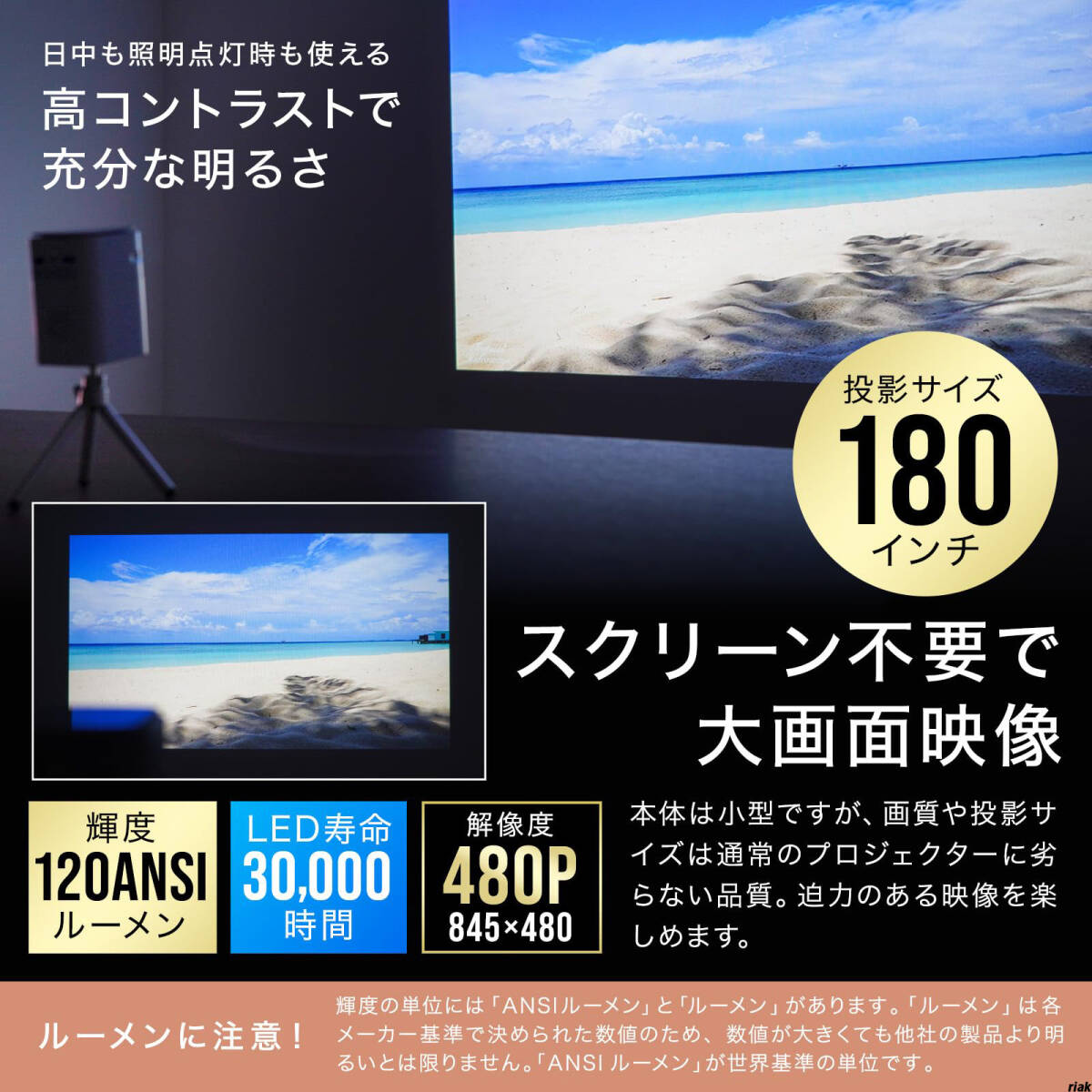 家庭や旅行、キャンプ先でも簡単に持ち運びでき、最大180インチの大画面映像を楽しめます。
