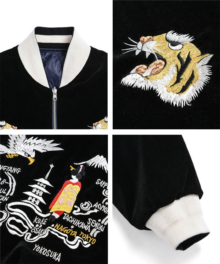 ・表地には、ベロア生地に前後スカジャン風の刺繍を入れています。