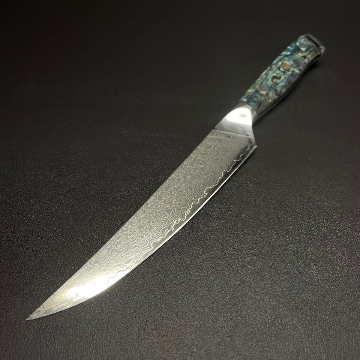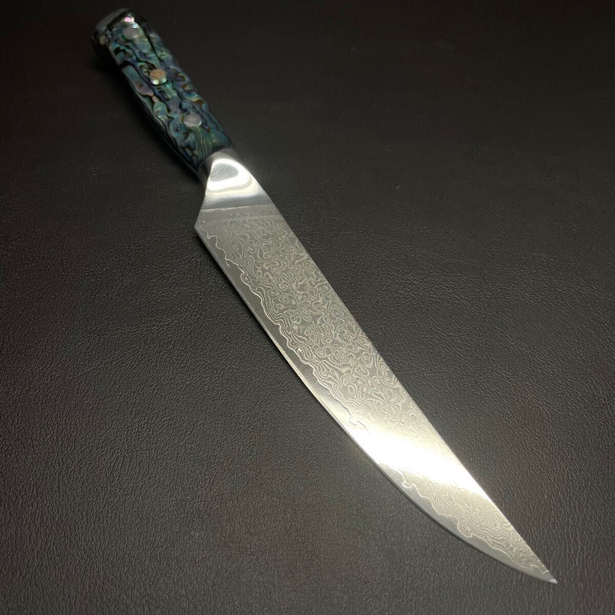 ダマスカスの模様と螺鈿の持柄が美しい、扱いやすいスライサー型のペティナイフになります。