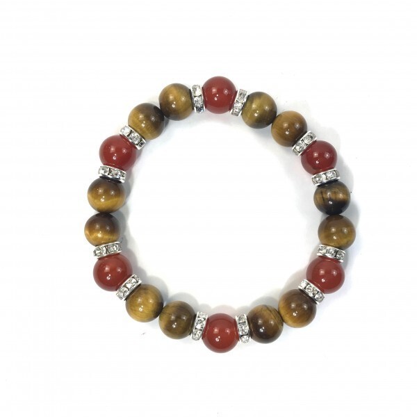 こちらは、タイガーアイと赤瑪瑙を組み合わせたブレスレットです。間にはロンデルを挟み高級感あるデザインに仕上がっています。石大きさは腕にも馴染みやすいように10mm玉で内径約17cm(伸可能)です。数に限りがございますので気になる方はお早めにどうぞ。サイズ調節も可能ですのでサイズ調節の場合は取引ナビにてご一報くださいませ。(サイズ調節無料です)