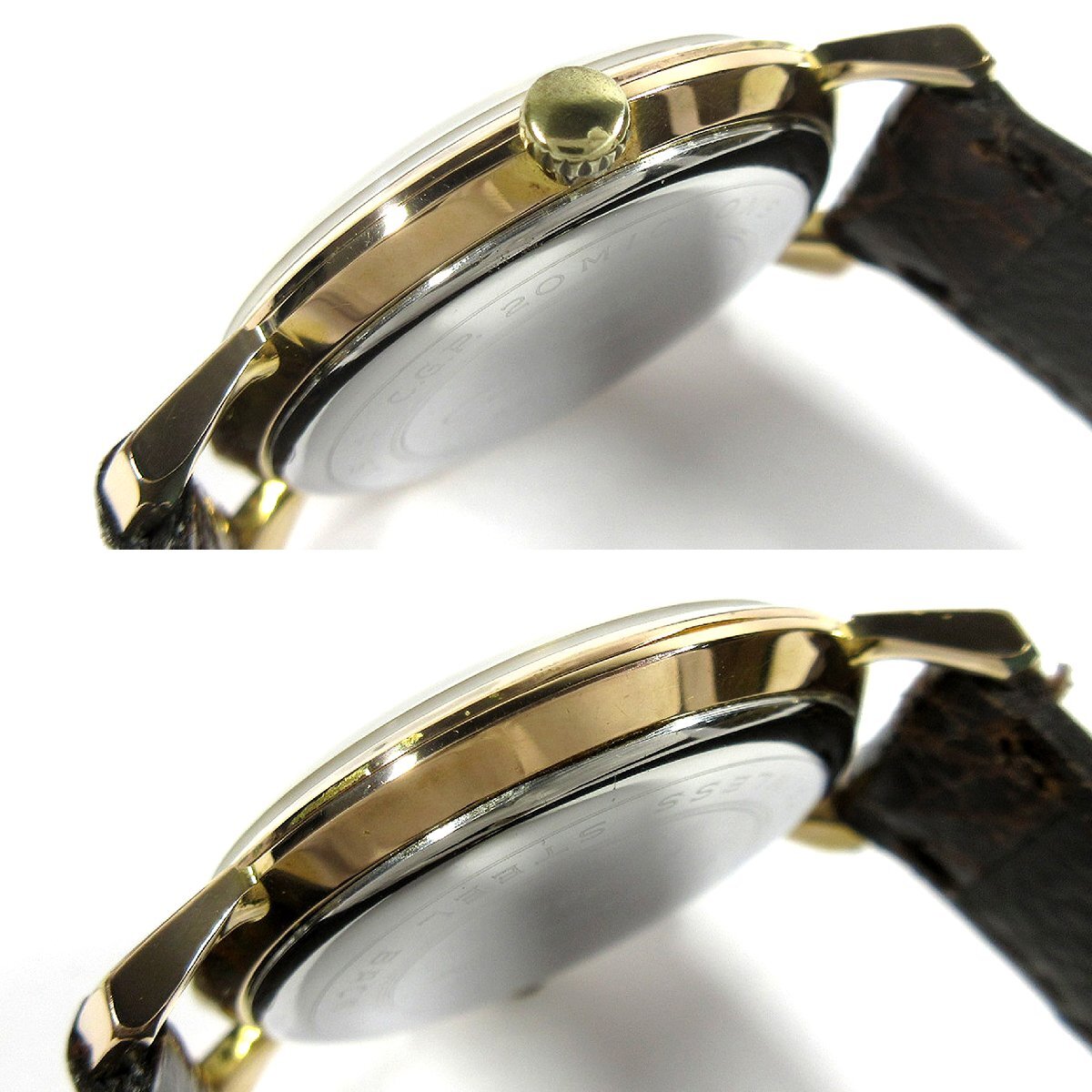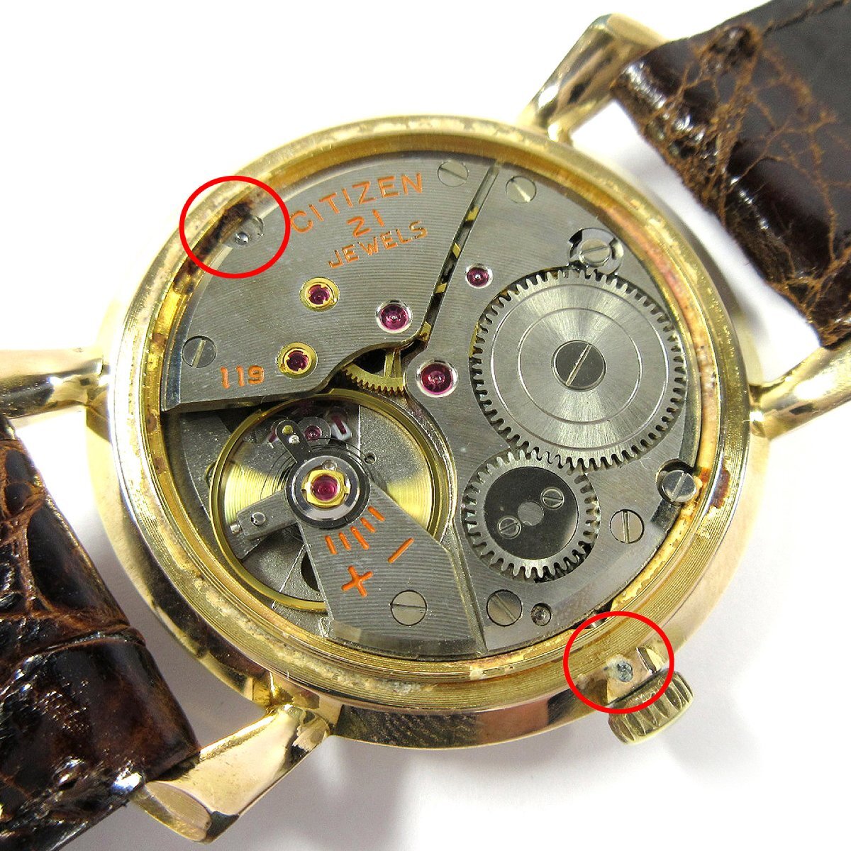 ケースに多少の小疵や擦れ、金張りの剥がれ、リューズ近くのケースに腐食