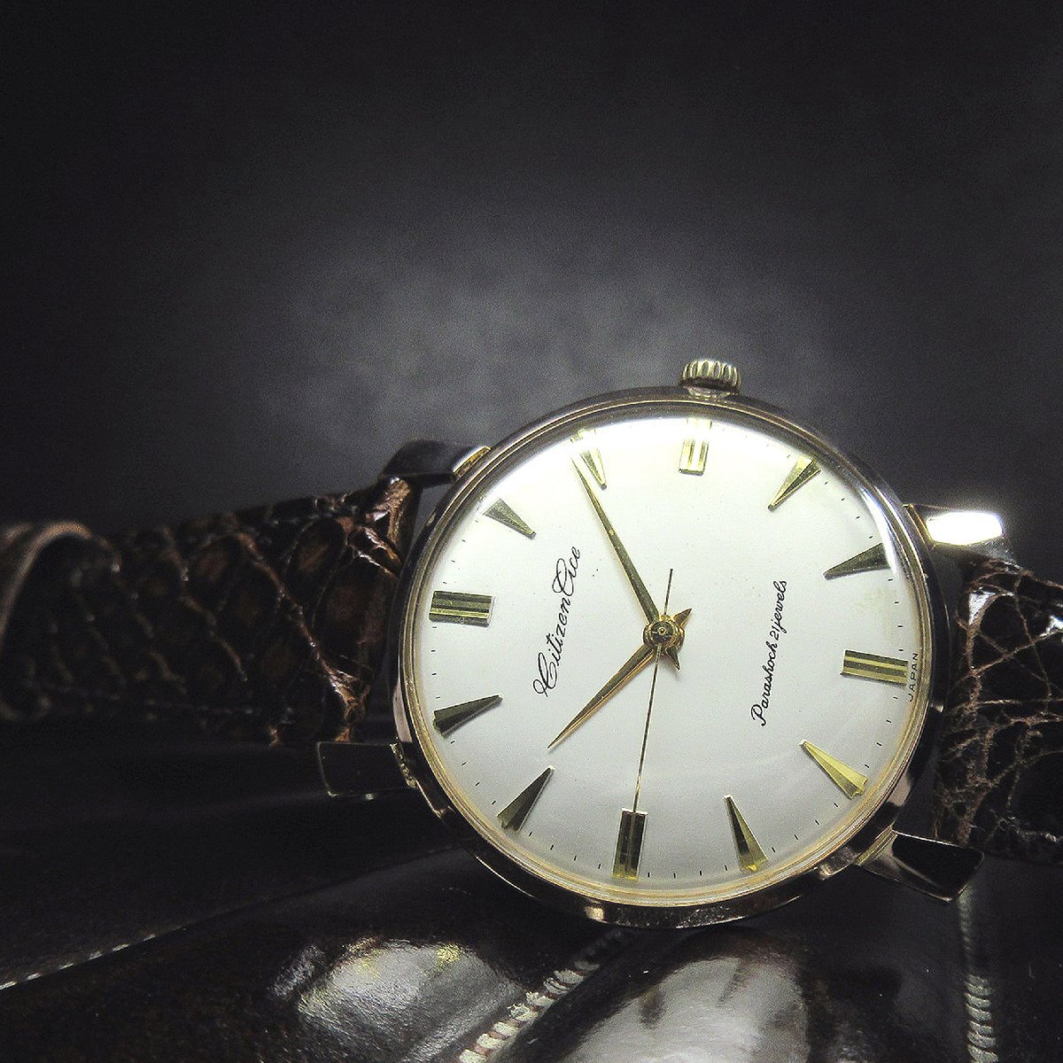 裏蓋に小疵・文字盤に多少の焼け、細かい極小さなシミ、5時半位置に変色