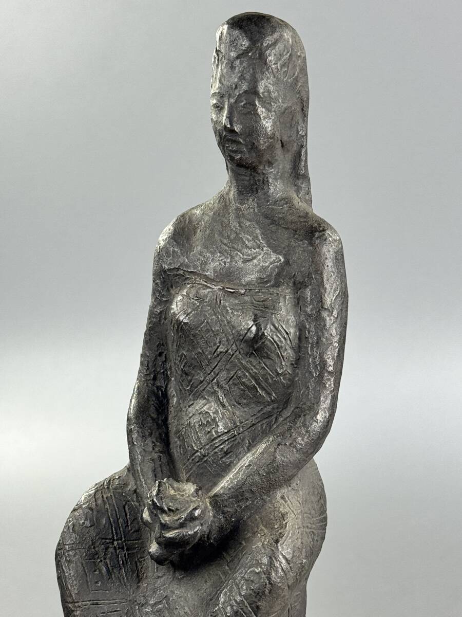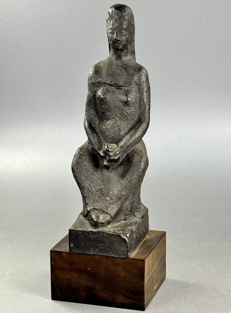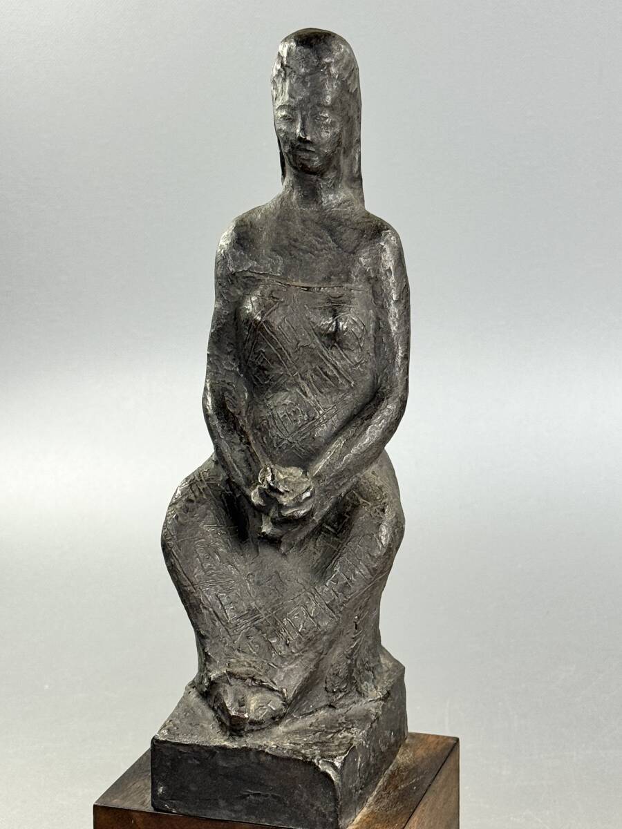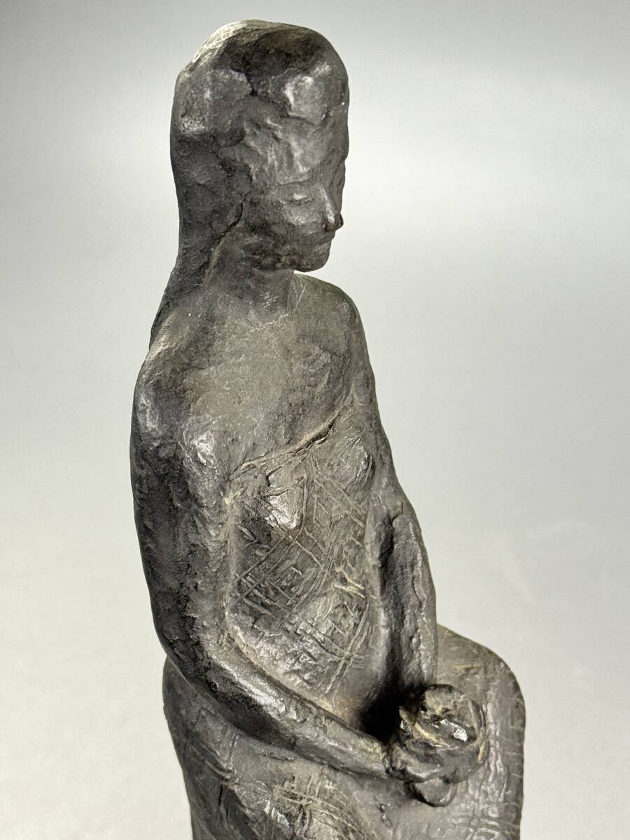 【偲】山本豊市 ブロンズ像 彫刻家 座った女性の姿 花を持つ 高さ約26.5㌢ 胴銘 金属工芸 銅像 インテリア 置物 r-142