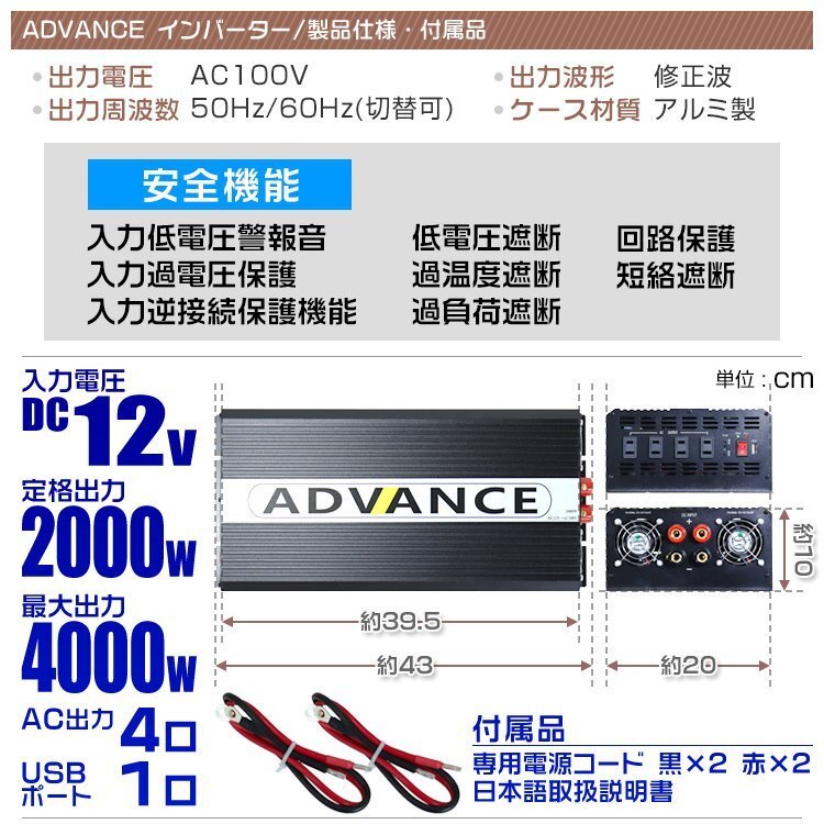 商品コード:C05A ■商品仕様 入力電圧:DC12V 出力電圧:AC100V 定格出力:2000w 最大出力:4000w 出力周波数:スイッチで50Hz/60Hz 変換可能 出力仕様:ACコンセント(4口)、USBポート(1口) 出力波形:矩形波(疑似正弦波) 本体サイズ(約):43×20×10cm 重量(約):3.65kg ケース:アルミ製 ■商品機能 回路保護 入力低電圧警報音 低電圧遮断 過温度遮断 過負荷遮断 短絡遮断 入力過電圧保護 入力逆接続保護機能 ■商品内容 インバーター本体 ×1 バッテリー接続コード 赤 ×2 バッテリー接続コード 黒 ×2 日本語取扱説明書 ■保証期間 7日間 ※商品到着後7日以内の初期不良・破損のみご対応させていただきます。 ■注意事項 ※本製品は12V車専用設計となっております。大型トラックなど24V車には絶対に使用しないでください。火災や故障の原因となります。 ※USBケーブルは付属しておりません。またUSBポートには電源供給以外の機能はありません。 ※USBハブは使用しないでください。接続機器やインバーター故障の原因となります。 ※定格出力は、すべての出力(コンセント+USB)の合計値です。 ※商品は、モニターによって色合いが異なって見える場合があります。 ※仕様・デザインは改良のため予告なく変更することがあります。 【もちろん新品未使用品です】 |