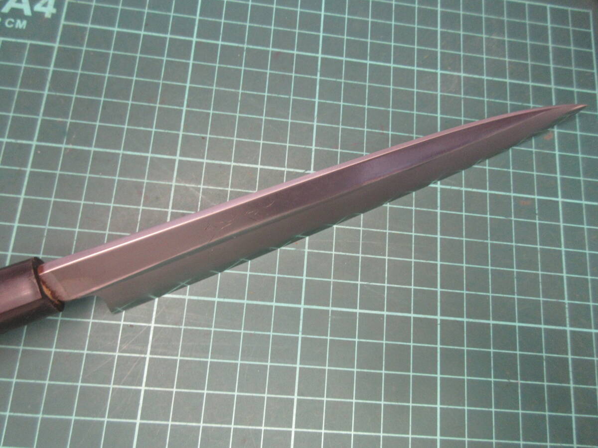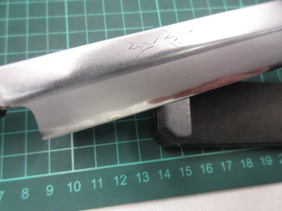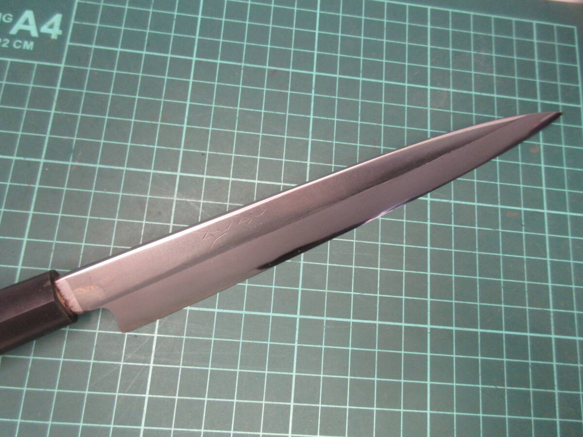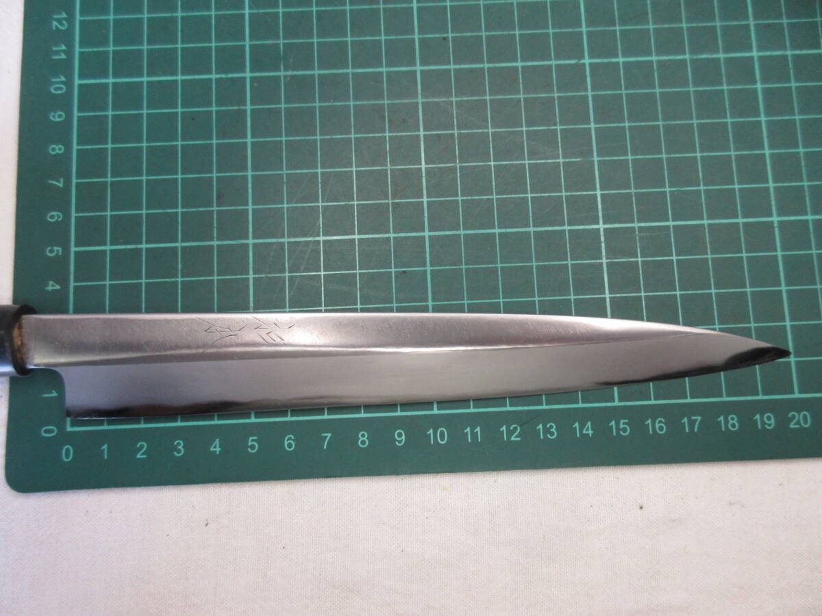 | 「受取連絡」が出来ない方の入札はお断りします。 こちらから評価を入れることはありません。 ■■■■■■■■■■■■■■■■■■■■■■■■■■■■■■■■■ 刺身包丁20cm 反りあります。裏すきはあると思います。 切刃が広目です。 最後の写真は磨き前です。 歪みや反り、落としきれない錆があります。全体的に使用感があります。 包丁のみの出品です、付属品はありません。 ■■■■■■■■■■■■■■■■■■■■■■■■■■■■■■■■■ 発送はレターパックです。(補償はありませんのでご注意ください。) 送料を抑えたい方はライト(430円)を選択してください。(ただし厚さ制限のため簡易包装です、新聞紙で包む程度ですので輸送時の衝撃で包丁の歪みや破損のリスクがありますのでご理解ください。) プラス(600円)は衝撃対策で厚めの梱包をします。(複数同梱の場合は包装が簡易になります。) 刃渡り21cmまではレターパックで発送できると思いますが長い刃は着払いゆうパックになります。 小振りな包丁なら3本くらいまでライトで同梱できます。プラスなら5本までは入ると思いますが21cm以上の包丁が絡むと本数が限られます。 以下は定型文です。 洋包丁は両刃、和包丁は片刃を前提に出品しています。 (タイトルと個別情報に刃付けの記載が無ければ上記のとおりです) 他の出品物と同梱できます。(システム上、着払いとのまとめ依頼ができません。落札後に同梱希望のメッセージを 頂ければ対応します。) 送料と材質についての質問には返答しません。 包丁につきましては全てジャンクとし、ノークレームノーリターンでお願いします。 出品からお品物が届くまでに時間が掛かった場合、鋼などの材質ですと変色や錆などの変質がある場合がございますのでご了承ください。 錆の酷い包丁は再生研磨していますが、あくまで素人仕事です。電動工具を用いての仕上げです。 削る、磨くは出来ますが歪みの修正は出来ません。中古品ですので歪みがある前提で入札してください。 磨きにより錆に強くなるメリットがありますが切った食材が張り付くデメリットがあります。 切れ味が悪いや、思ったより汚いなどのクレームはご遠慮ください。 触れば怪我をするほどの最低限の刃付けはしてあります、開封時にご注意ください。 肉眼での検品ですので微細な傷や欠けを見落としている可能性もありますので写真を参照してください。 現状維持のために防錆に椿油を塗布していることがありますので写真に不自然な艶が写っている時があります、ご了承ください。 (鋼の洋包丁の場合は中子にも塗布するために柄にも油が散布しています。ご使用前に洗浄してください。) 中子やリベットの錆を落とす為に柄ごと研磨する場合がありますので、柄に研磨痕が残っている時があります。 柄の仕上げに軽く蝋引きしています。 片刃の場合、研ぎですが砥石傷が付くのを嫌ってベタ研ぎはせず、峰をわずかに浮かして仕上げています。(綺麗な裏押しの和包丁はベタ研ぎです) 10対0ではなく9対1位の感覚です、完璧な片刃をお求めの方は入札をご遠慮ください。 (和包丁は片刃前提です、洋包丁が片刃の場合にはタイトルと個別情報に片刃と記載してあります) 有効利用、再生利用できる方の入札をおまちしています。 写真で判断いただき、商品説明を理解出来る方のみ入札をお願いします。 クリーニングなどはせず、写真のままお送りします。 専門知識が乏しい為、質問に答えられない時があります。 ブランド品の真偽については不明とさせて頂きます。 素人による中古出品です、すり替え防止の為にもノークレームノーリターンでお願いします。 入金を確認しました時点でお取り置き終了と判断し発送準備にはいります。 同梱発送、お取り置きを希望の方は入金前に連絡頂くと助かります。 落札後、48時間以内の初回連絡、五日以内の入金が確認出来ません場合は落札者様都合のキャンセルとさせて頂きます。 その場合落札者様に非常に悪い評価とブラックリストへの登録を同時に行いますのでご了承ください。 (以後こちらのオークションに入札が出来なくなります) #お取引に不安を感じる評価の方は削除させて頂く事があります。 #総合評価が高くても直近に悪い評価がある方も削除致します。 #いたずら入札を防ぐ為、1万円以上の入札額時の場合は新規の方の入札をお断りします。 #(どうしても入札したい時は質問欄より入札意思をお伝えください。) *評価を入れて頂くと反射的にお返しする形を取っています、不要の方は評価を入れないで下さい。 *こちらから評価をお付けすることはありません、不要の方は「受取連絡」で終了して下さい。 自己紹介欄もあわせてお読みください。 | ||