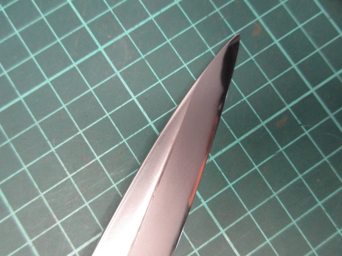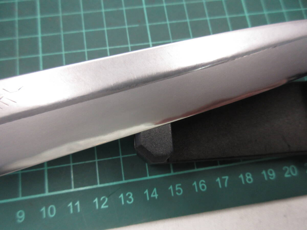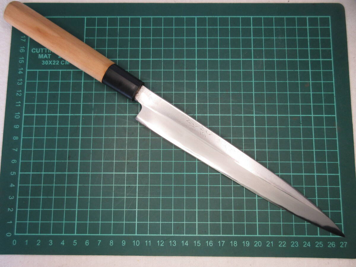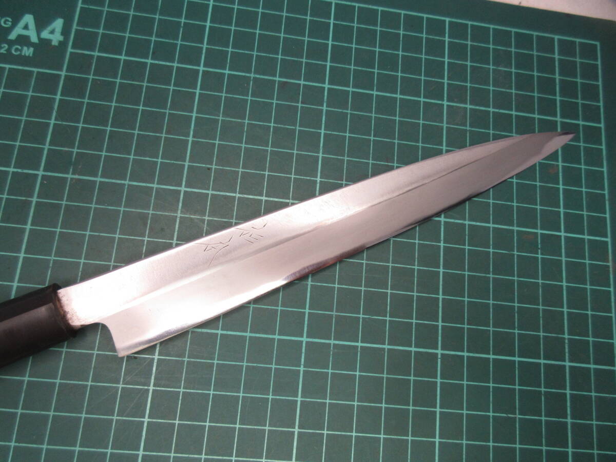 | 「受取連絡」が出来ない方の入札はお断りします。 こちらから評価を入れることはありません。 ■■■■■■■■■■■■■■■■■■■■■■■■■■■■■■■■■ 刺身包丁20cm 反りあります。裏すきはあると思います。 切刃が広目です。 最後の写真は磨き前です。 歪みや反り、落としきれない錆があります。全体的に使用感があります。 包丁のみの出品です、付属品はありません。 ■■■■■■■■■■■■■■■■■■■■■■■■■■■■■■■■■ 発送はレターパックです。(補償はありませんのでご注意ください。) 送料を抑えたい方はライト(430円)を選択してください。(ただし厚さ制限のため簡易包装です、新聞紙で包む程度ですので輸送時の衝撃で包丁の歪みや破損のリスクがありますのでご理解ください。) プラス(600円)は衝撃対策で厚めの梱包をします。(複数同梱の場合は包装が簡易になります。) 刃渡り21cmまではレターパックで発送できると思いますが長い刃は着払いゆうパックになります。 小振りな包丁なら3本くらいまでライトで同梱できます。プラスなら5本までは入ると思いますが21cm以上の包丁が絡むと本数が限られます。 以下は定型文です。 洋包丁は両刃、和包丁は片刃を前提に出品しています。 (タイトルと個別情報に刃付けの記載が無ければ上記のとおりです) 他の出品物と同梱できます。(システム上、着払いとのまとめ依頼ができません。落札後に同梱希望のメッセージを 頂ければ対応します。) 送料と材質についての質問には返答しません。 包丁につきましては全てジャンクとし、ノークレームノーリターンでお願いします。 出品からお品物が届くまでに時間が掛かった場合、鋼などの材質ですと変色や錆などの変質がある場合がございますのでご了承ください。 錆の酷い包丁は再生研磨していますが、あくまで素人仕事です。電動工具を用いての仕上げです。 削る、磨くは出来ますが歪みの修正は出来ません。中古品ですので歪みがある前提で入札してください。 磨きにより錆に強くなるメリットがありますが切った食材が張り付くデメリットがあります。 切れ味が悪いや、思ったより汚いなどのクレームはご遠慮ください。 触れば怪我をするほどの最低限の刃付けはしてあります、開封時にご注意ください。 肉眼での検品ですので微細な傷や欠けを見落としている可能性もありますので写真を参照してください。 現状維持のために防錆に椿油を塗布していることがありますので写真に不自然な艶が写っている時があります、ご了承ください。 (鋼の洋包丁の場合は中子にも塗布するために柄にも油が散布しています。ご使用前に洗浄してください。) 中子やリベットの錆を落とす為に柄ごと研磨する場合がありますので、柄に研磨痕が残っている時があります。 柄の仕上げに軽く蝋引きしています。 片刃の場合、研ぎですが砥石傷が付くのを嫌ってベタ研ぎはせず、峰をわずかに浮かして仕上げています。(綺麗な裏押しの和包丁はベタ研ぎです) 10対0ではなく9対1位の感覚です、完璧な片刃をお求めの方は入札をご遠慮ください。 (和包丁は片刃前提です、洋包丁が片刃の場合にはタイトルと個別情報に片刃と記載してあります) 有効利用、再生利用できる方の入札をおまちしています。 写真で判断いただき、商品説明を理解出来る方のみ入札をお願いします。 クリーニングなどはせず、写真のままお送りします。 専門知識が乏しい為、質問に答えられない時があります。 ブランド品の真偽については不明とさせて頂きます。 素人による中古出品です、すり替え防止の為にもノークレームノーリターンでお願いします。 入金を確認しました時点でお取り置き終了と判断し発送準備にはいります。 同梱発送、お取り置きを希望の方は入金前に連絡頂くと助かります。 落札後、48時間以内の初回連絡、五日以内の入金が確認出来ません場合は落札者様都合のキャンセルとさせて頂きます。 その場合落札者様に非常に悪い評価とブラックリストへの登録を同時に行いますのでご了承ください。 (以後こちらのオークションに入札が出来なくなります) #お取引に不安を感じる評価の方は削除させて頂く事があります。 #総合評価が高くても直近に悪い評価がある方も削除致します。 #いたずら入札を防ぐ為、1万円以上の入札額時の場合は新規の方の入札をお断りします。 #(どうしても入札したい時は質問欄より入札意思をお伝えください。) *評価を入れて頂くと反射的にお返しする形を取っています、不要の方は評価を入れないで下さい。 *こちらから評価をお付けすることはありません、不要の方は「受取連絡」で終了して下さい。 自己紹介欄もあわせてお読みください。 | ||