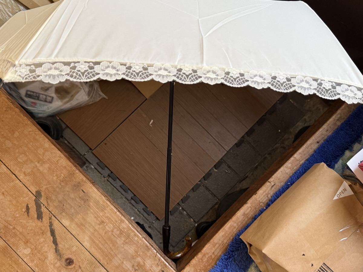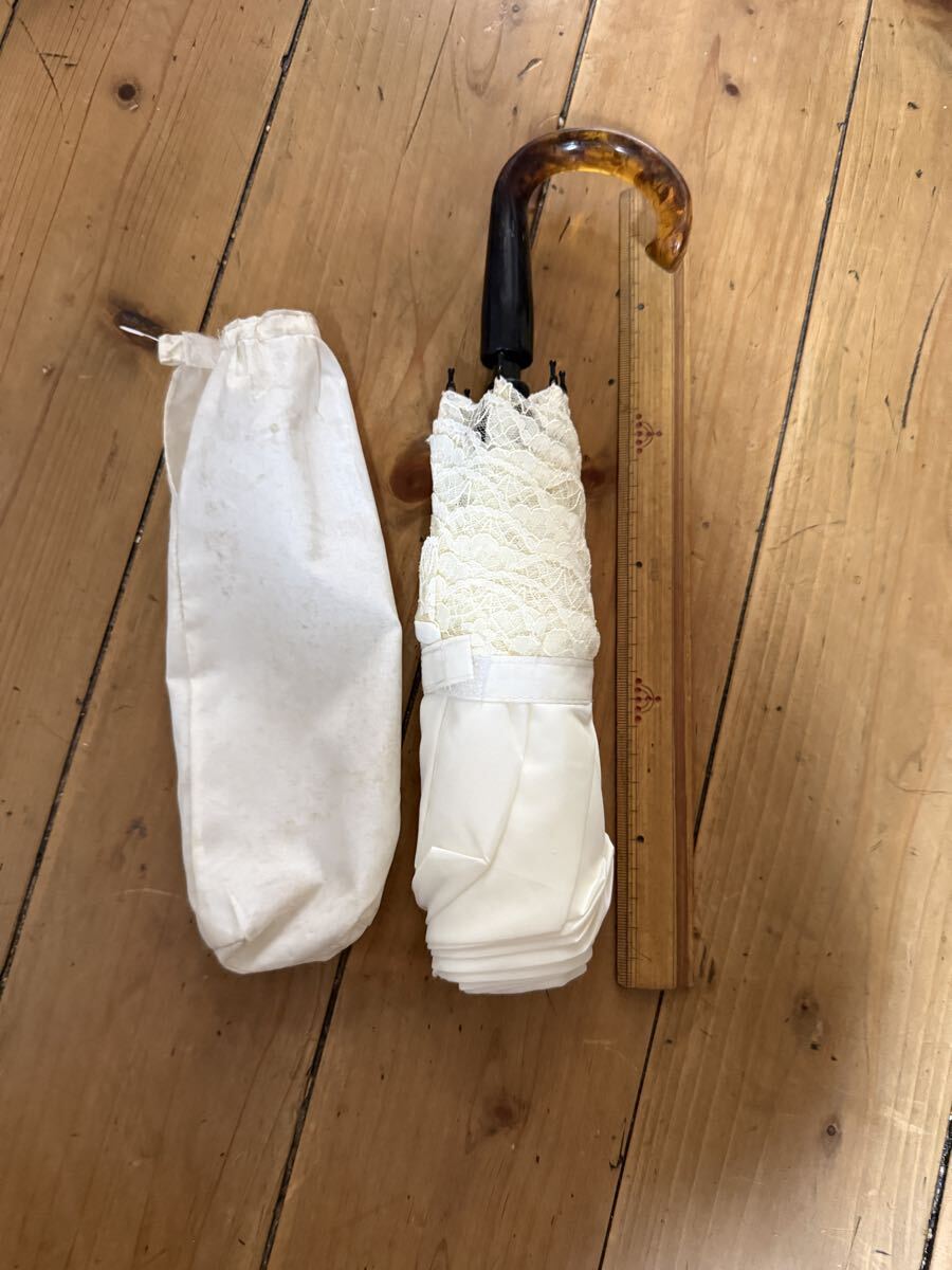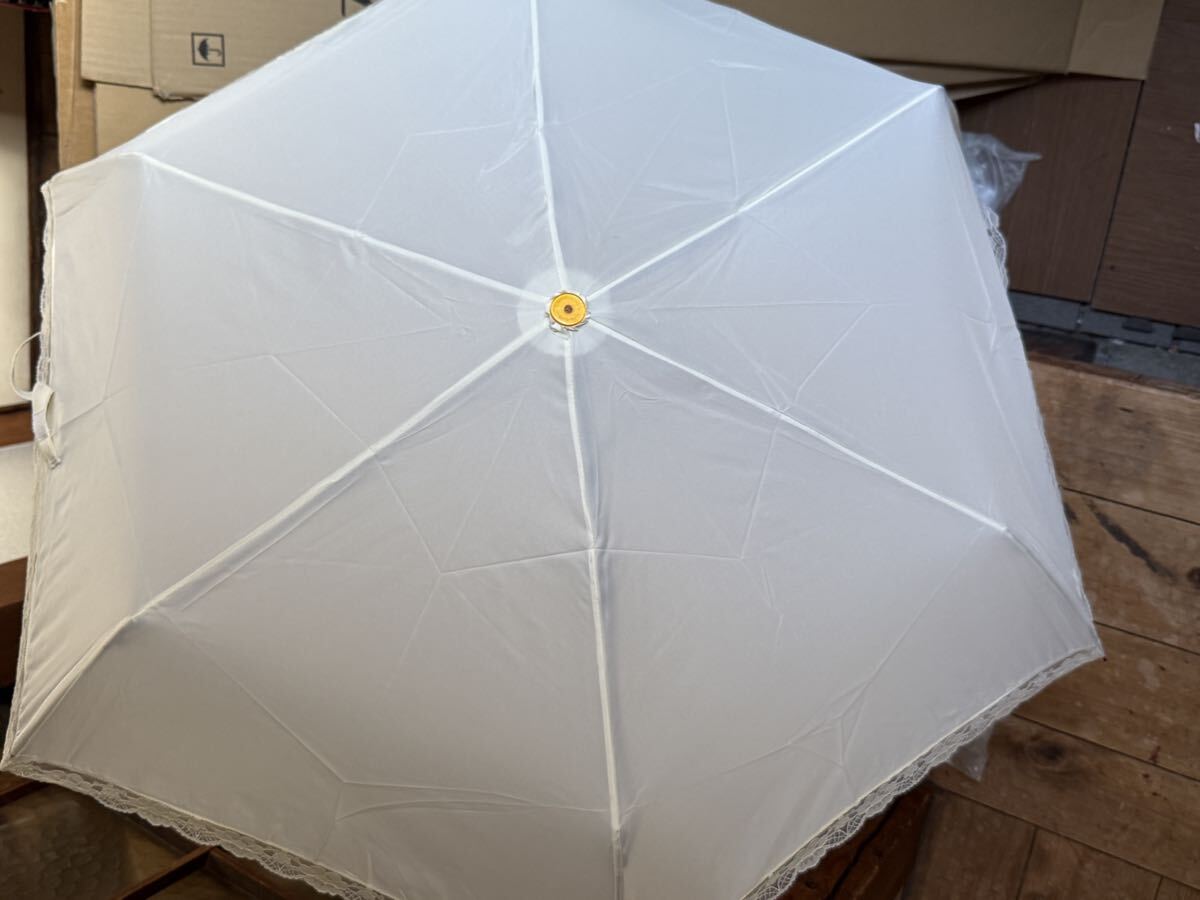 Wpc.の完全遮光日傘「UVO(ウーボ)」の折りたたみ傘(2段タイプ)白地の本体に刺繍フラワーがあしらわれています。