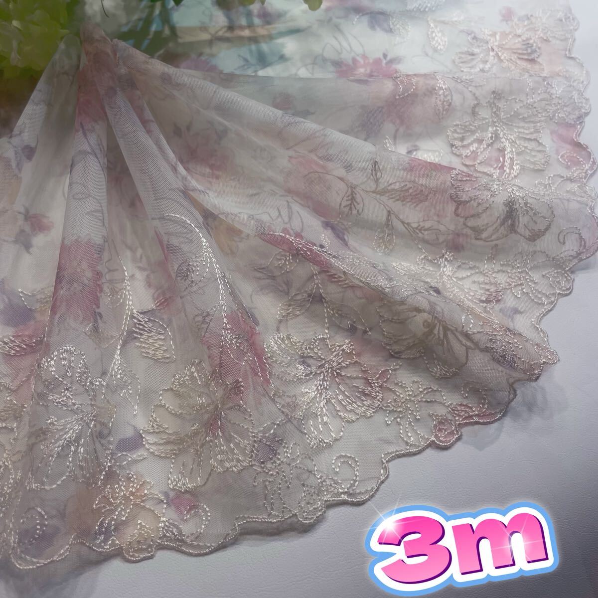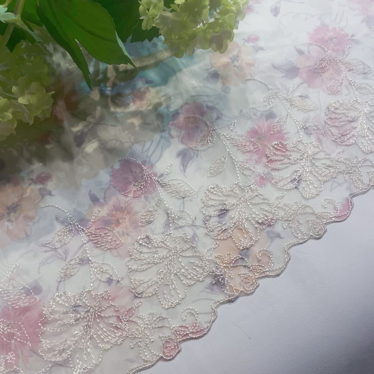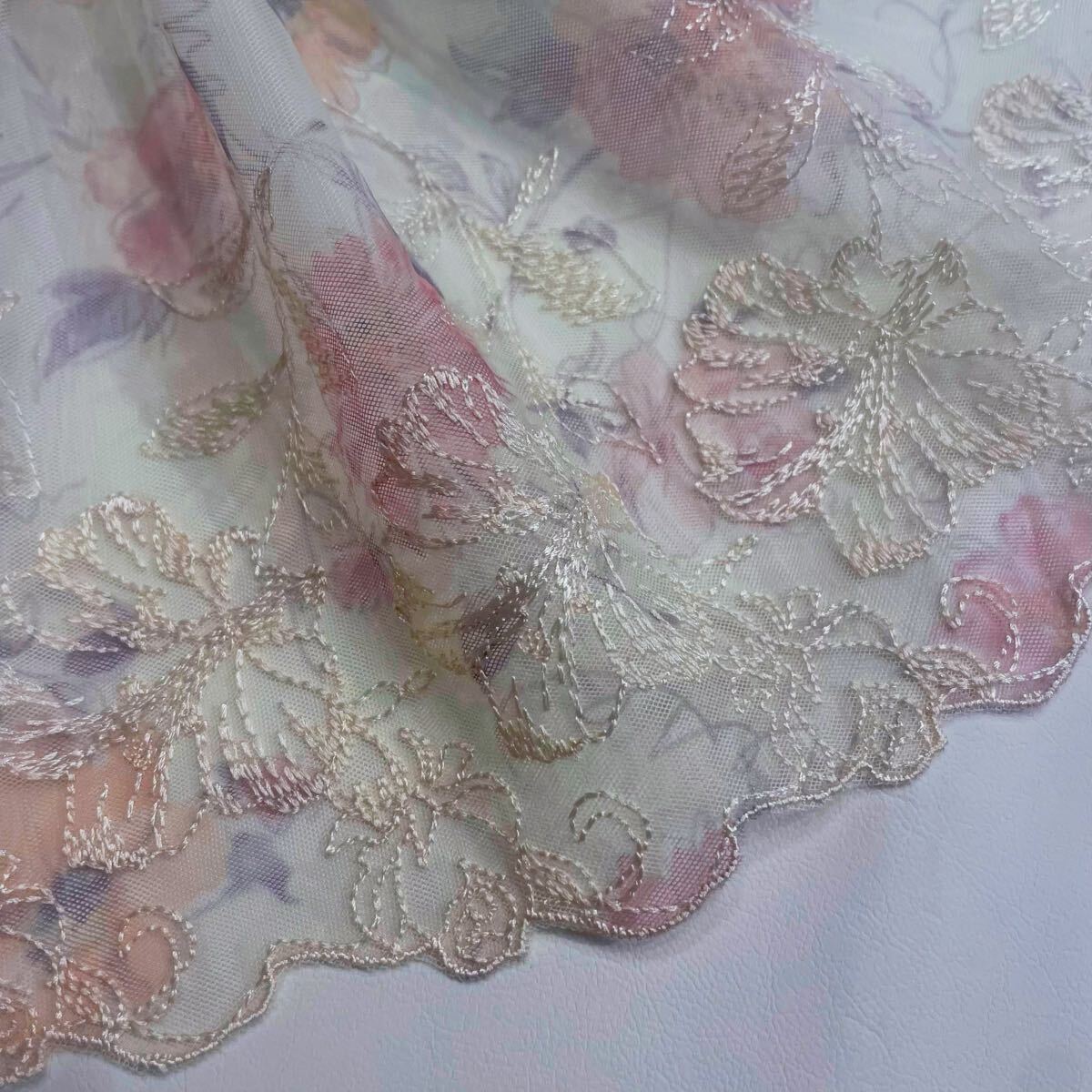透け感のあるチュール生地に、上品なベージュ系の刺繍と淡い花柄プリントが重なり、華やかで繊細な雰囲気を演出してくれるレース生地です。