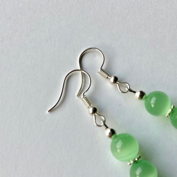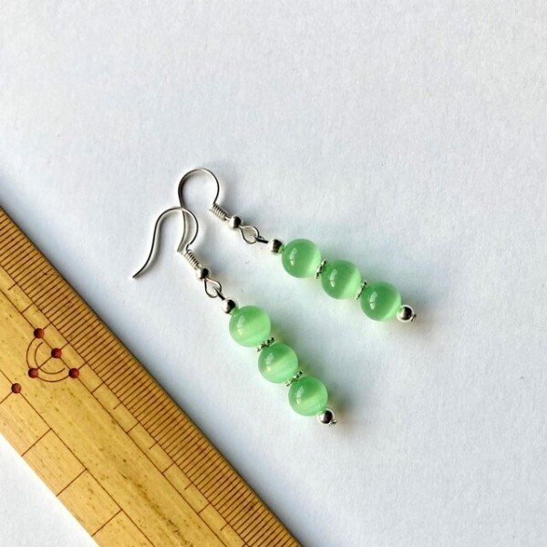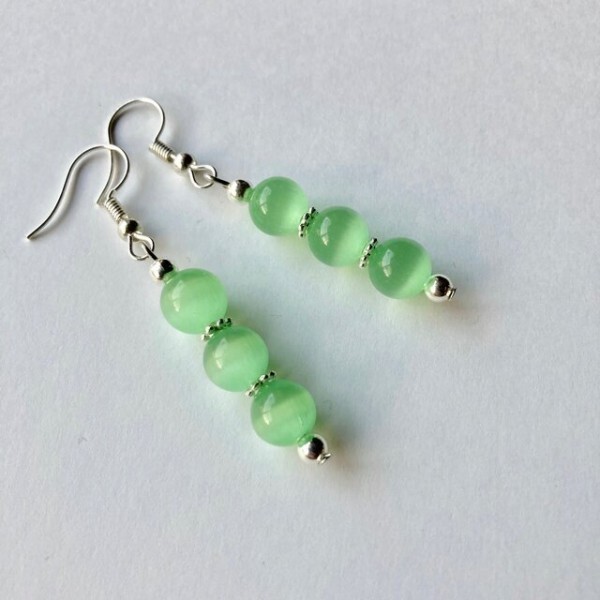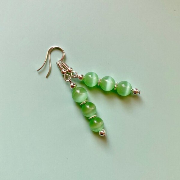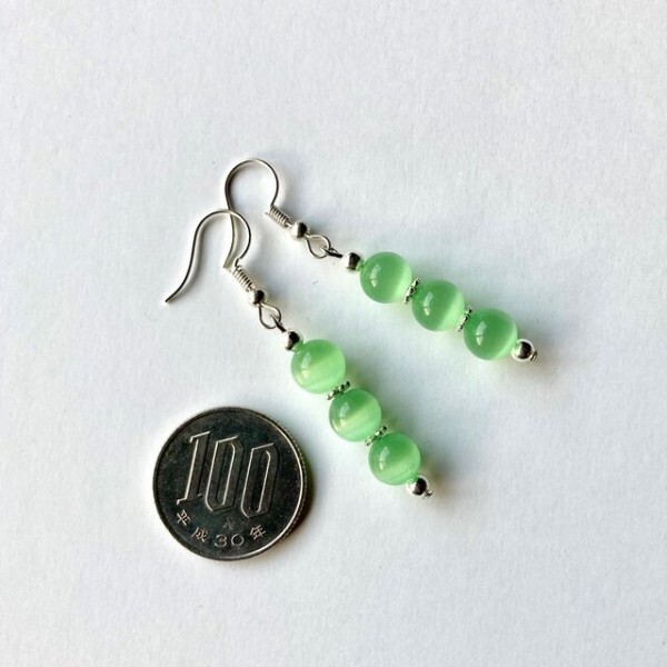 こちらは、8mm玉のキャッツアイを3個並べたフックピアスです。女性の可愛らしさを引き立ててくれるピアスになっております。シンプルなデザインですのでコーディネートにも合わせやすいデザインで、使い勝手がいいアイテムとなっております。