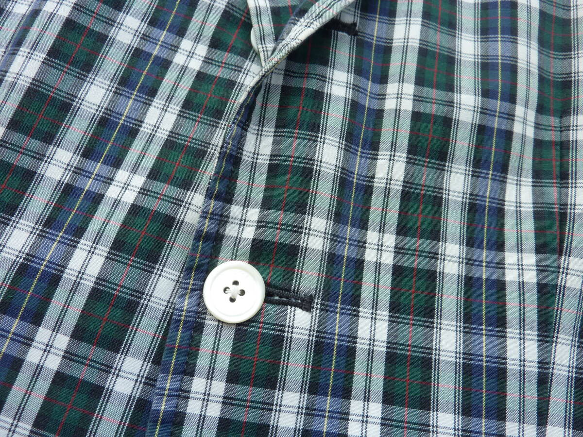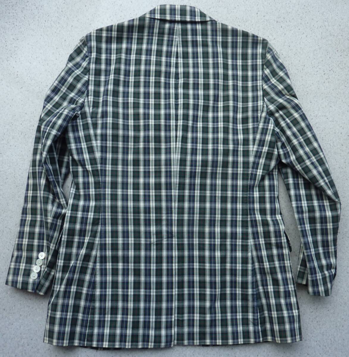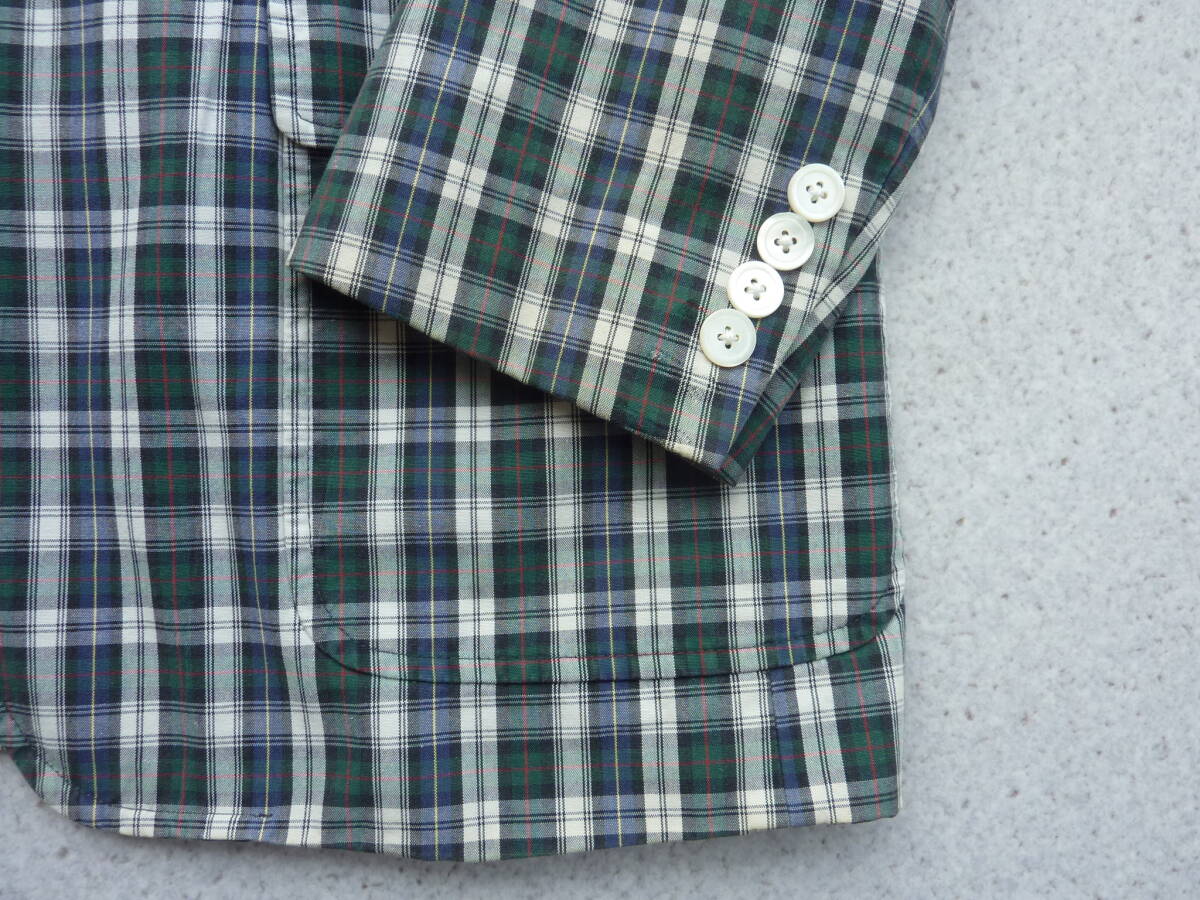 綿100%のタータンチェック生地で、3B(貝ボタン)段返り、センターベント、サイドパッチポケット、背抜きに仕立てられたジャケットです。