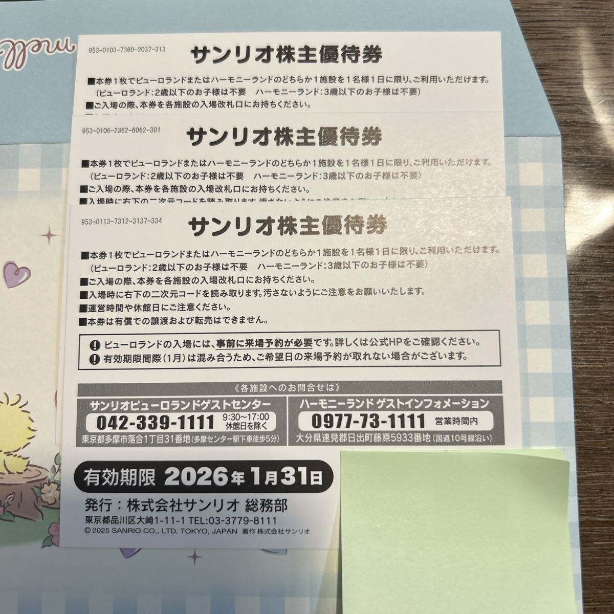 サンリオ 株主優待券 3枚使用期限2026年1月31日