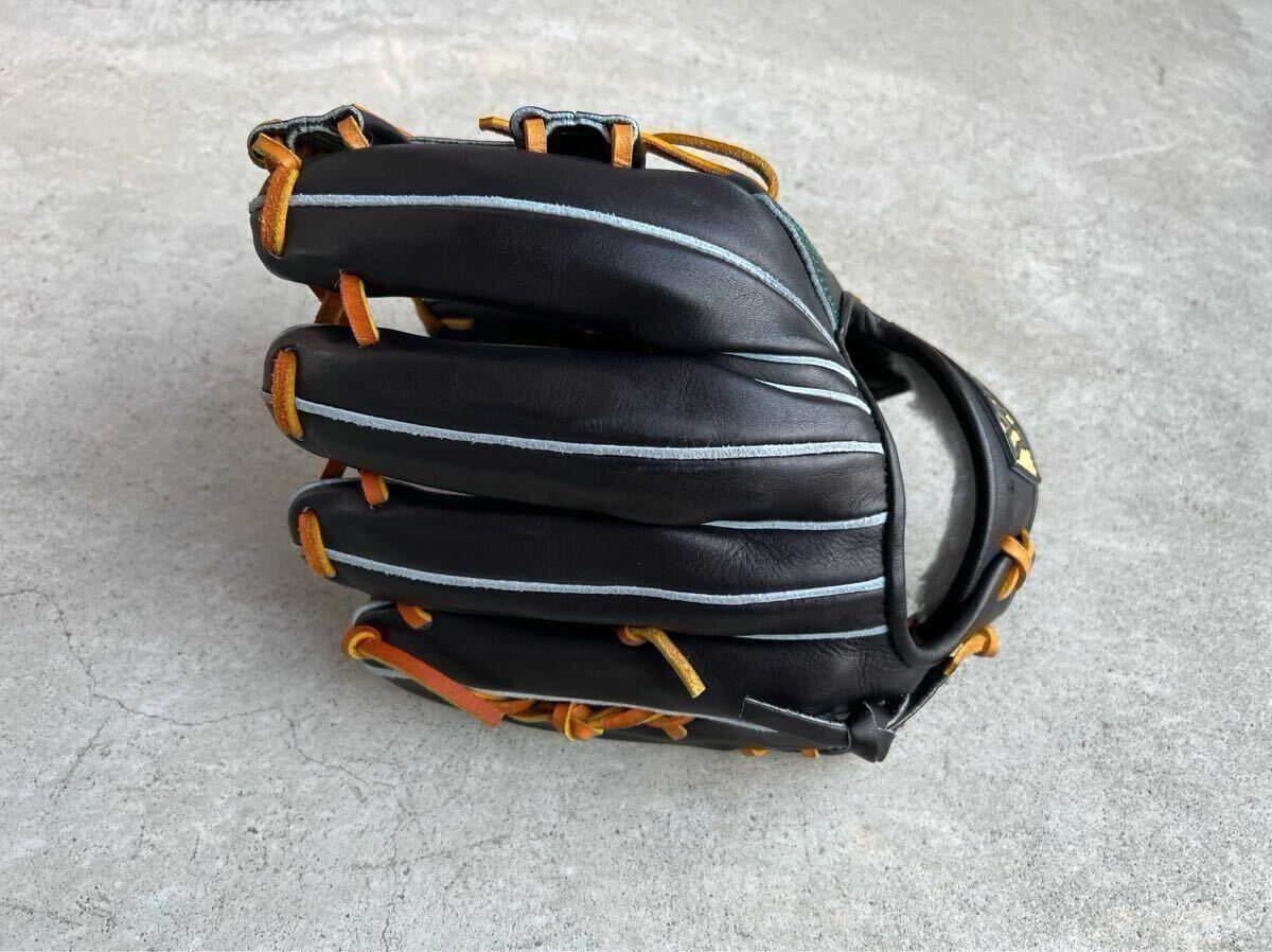 グラブサイズに対して指股が高いので捕球面が広いグラブです。