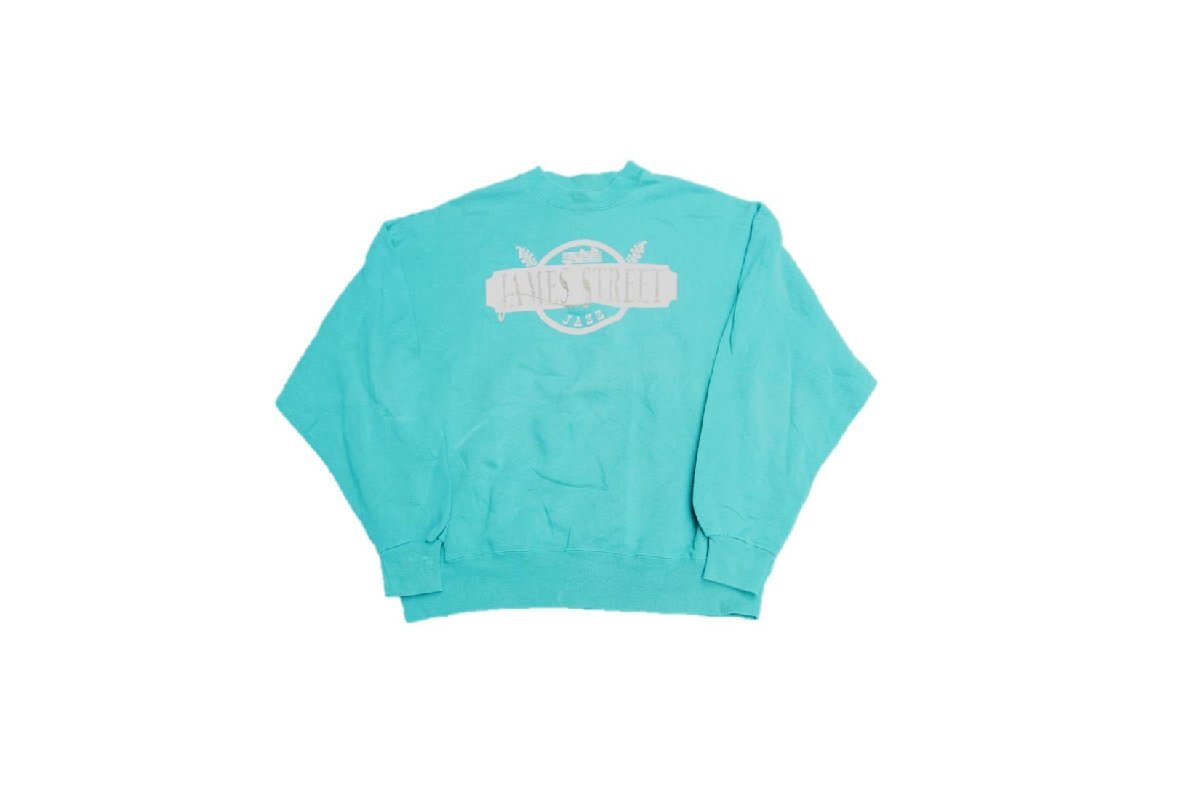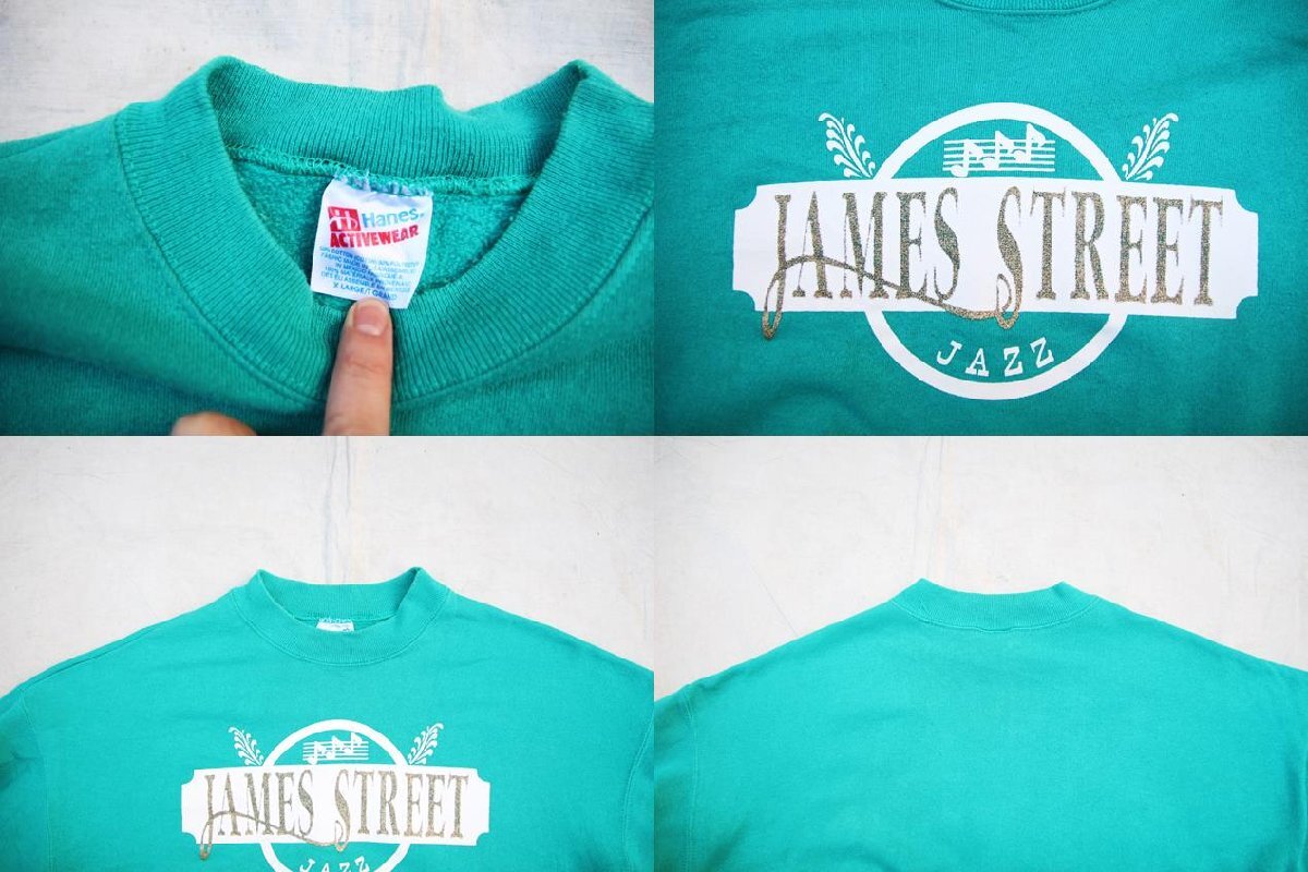 1990年代頃のHanes製プリントスウェットシャツとなります。発色の良いライトグリーン色にフロントのみのプリントで、恐らくアメリカペンシルバニア州ピッツバーグのジャズで有名なJames Streetのプリントになるかと思います。ジャズ関連のアイテムは古着でも数が少なく、探されている方も多いかと思います。サイズもXLと人気の大き目サイズですのでお好きな方は是非この機会にご検討下さい。