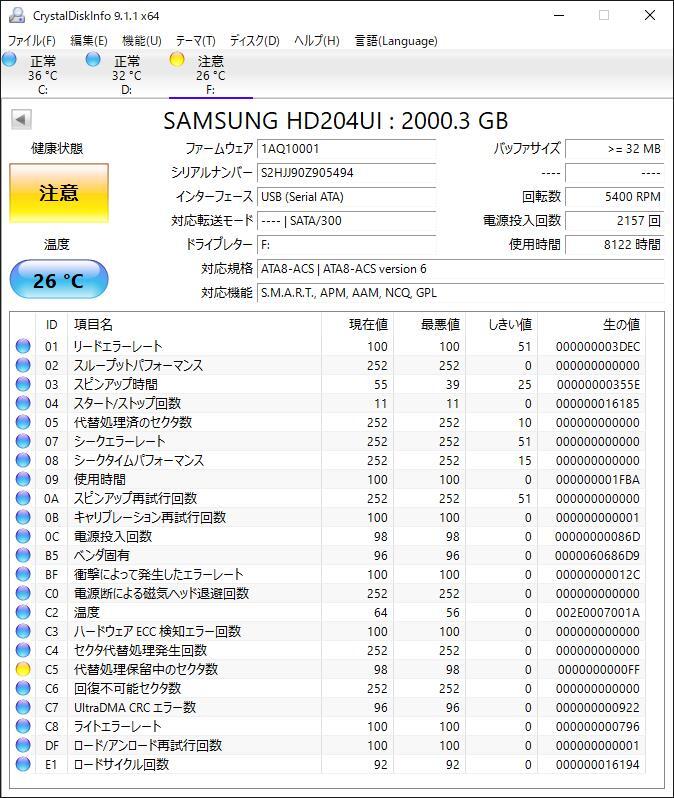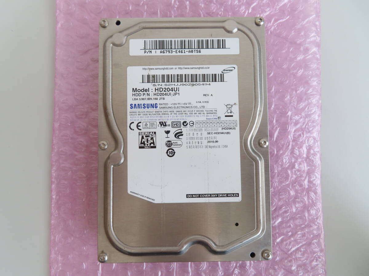 サムスン (SAMSUNG) HD204UI [2TB SATA300 5400rpm] スペック 容量 2TB 回転数 5400 rpm インターフェイス Serial ATA300 ・CrystalDiskInfoで調べたところ注意表示、使用時間8122時間、電源投入回数2157回でした。 ・動作確認後フォーマット済みの中古になります。 ※専門知識がないため、見落とし等がある可能性がありますが現状優先とさせて戴きます。 ■現状渡しのノークレーム・ノーリターン・ノーサポートでお願い致します。 ■知識・経験のある方、トラブル発生時には自己解決能力がある方のご入札でお願いいたします。 | |||