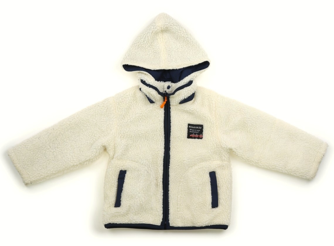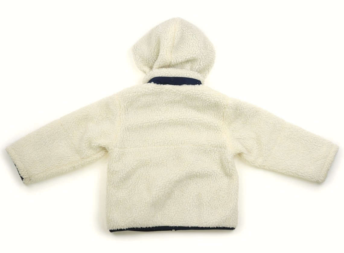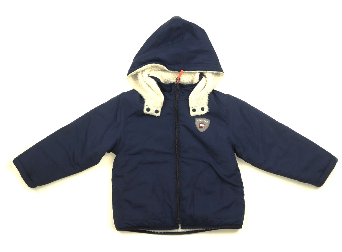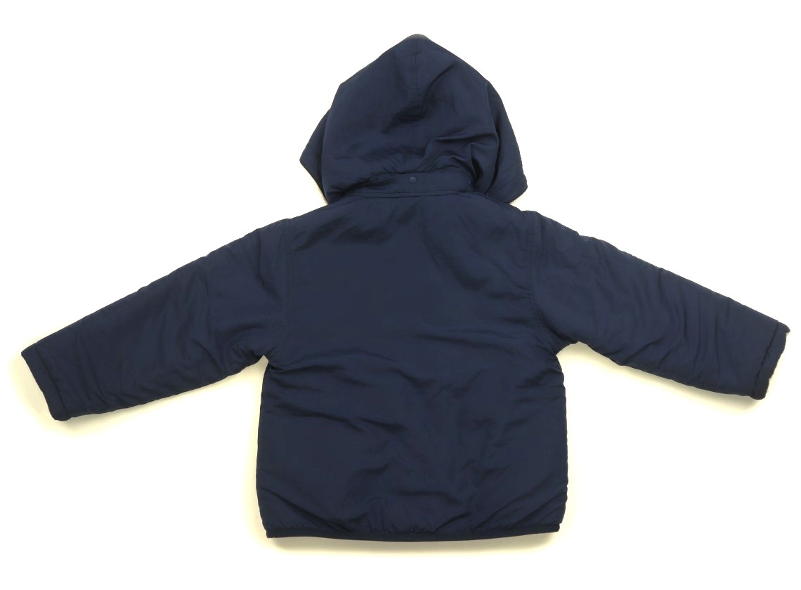 表地・ボア・中綿はポリエステル素材リバーシブル仕様。フードの取り外しが可能です。ネイビー側の左袖に線状の白い汚れが複数あります。ボア側もフードは縫い付けです。と腹部に1cmほどの汚れ、袖口に黒ずみ汚れがあり。まだまだ普段着として活躍してくれそうです。