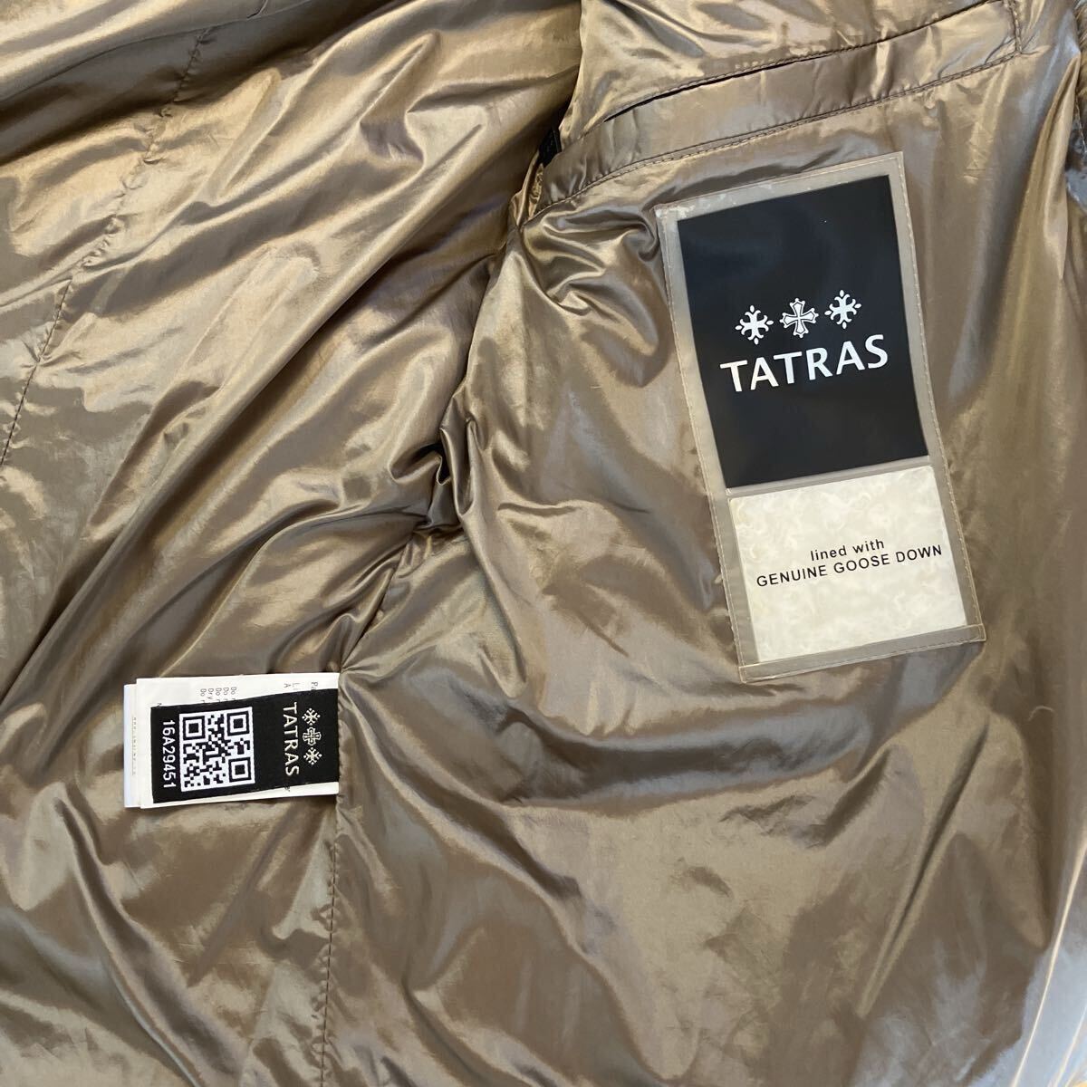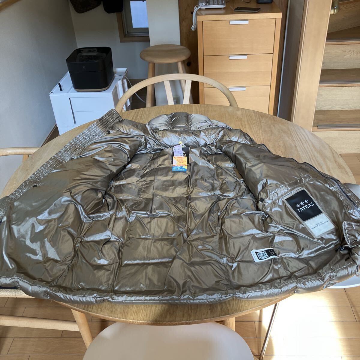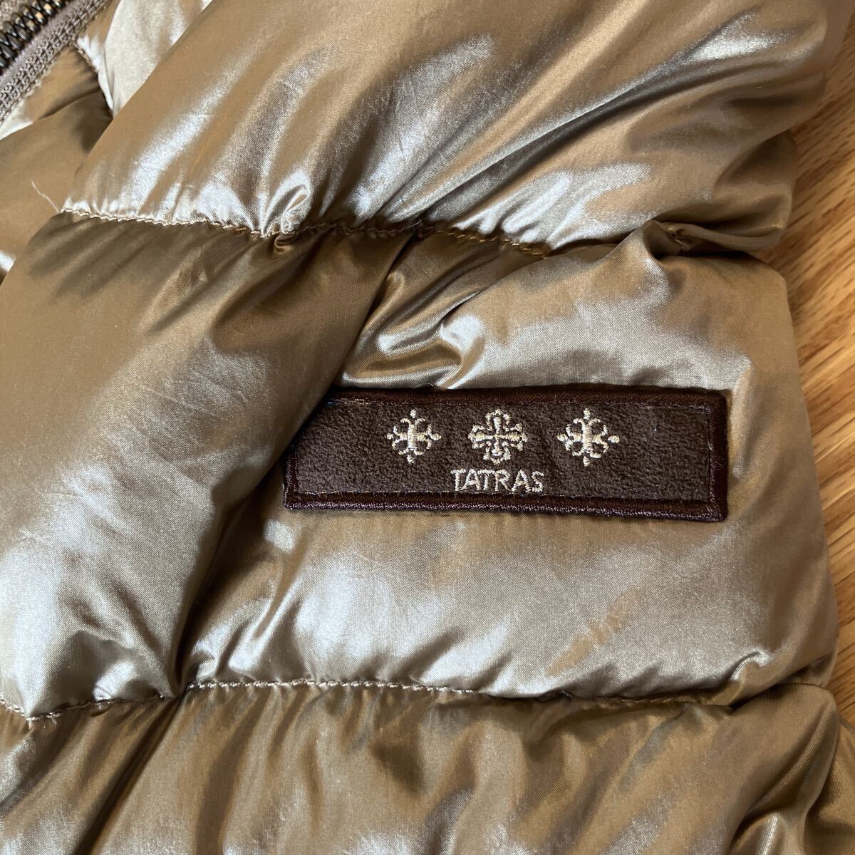 ☆タトラスのダウンジャケットです。お色は明るいシャンパンゴールドの様なベージュ色です。前に4つのポケットと右見頃裏に大きめのジップポケット1つがあります。フードは取り外しできます。ポーランド製になります。