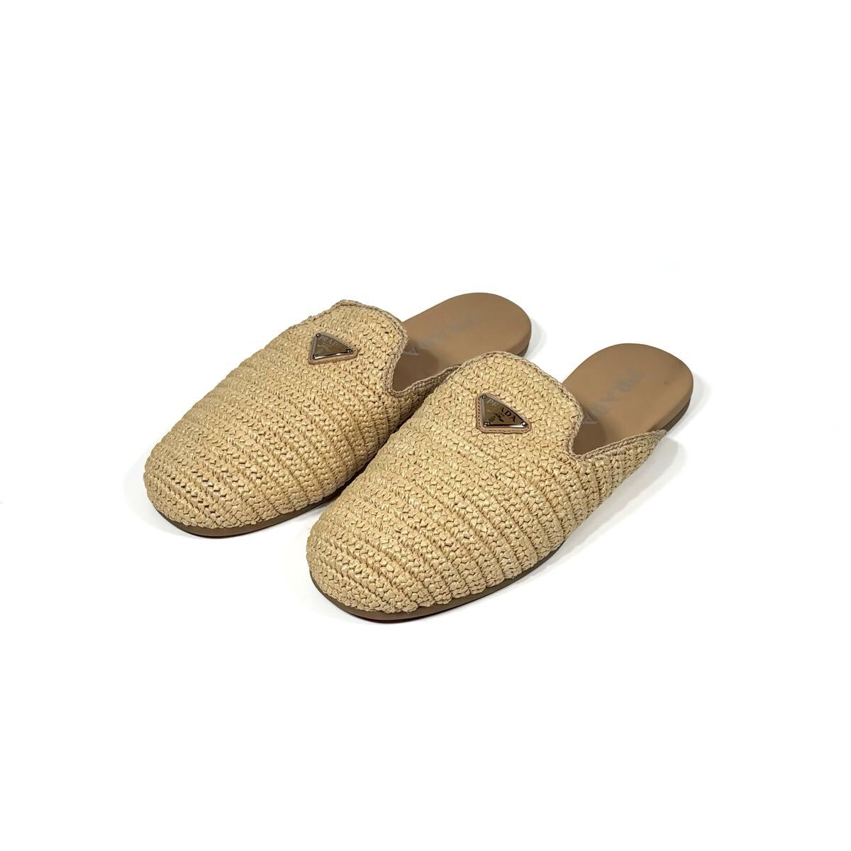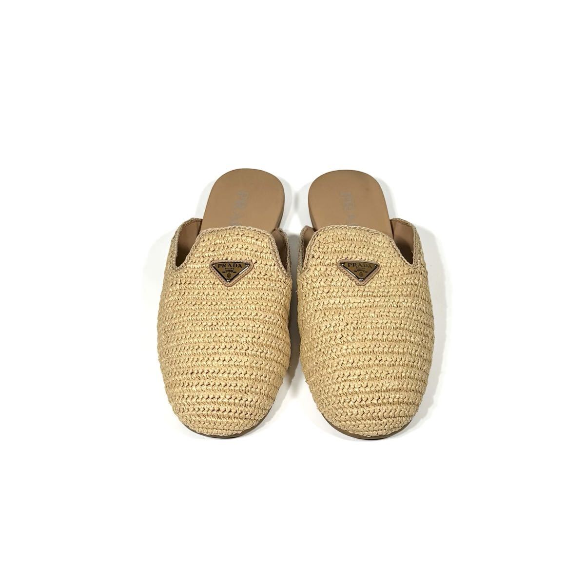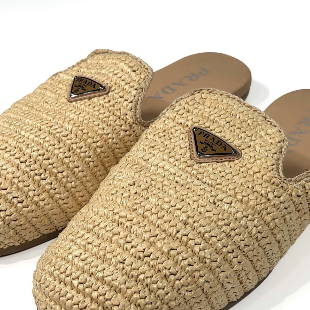 夏らしい軽やかな印象のクロシェ(かぎ編み)デザインが特徴的なミュールです。ナチュラルなラフィア素材が上品でリラックス感のある雰囲気を演出。甲部分にはブランドの象徴でもあるエナメルメタルのトライアングルロゴがあしらわれ、高級感があります。